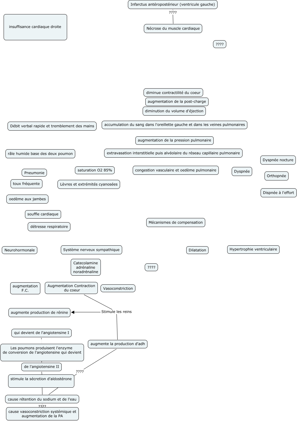 Cette carte de concepts créée avec IHMC CmapTools traite de: ic, augmente la production d'adh ???? cause rétention du sodium et de l'eau, cause rétention du sodium et de l'eau ???? cause vasoconstriction systémique et augmentation de la PA, qui devient de l'angiotensine I de l'angiotensine II, Augmentation Contraction du coeur Stimule les reins augmente la production d'adh, de l'angiotensine II ???? cause rétention du sodium et de l'eau, de l'angiotensine II ???? stimule la sécretion d'aldostérone, Infarctus antéropostérieur (ventricule gauche) ???? Nécrose du muscle cardiaque, Augmentation Contraction du coeur Stimule les reins augmente production de rénine