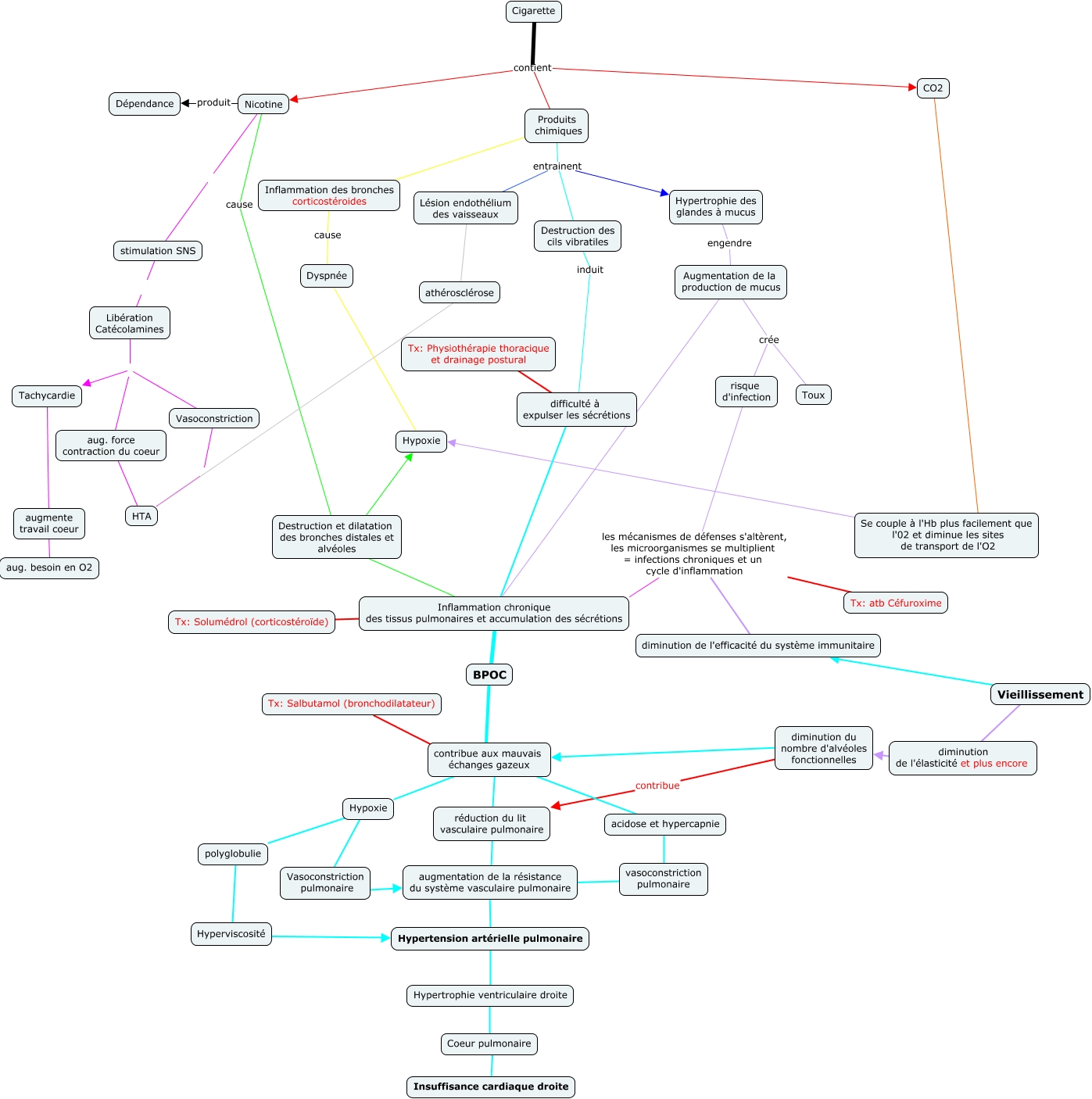 Cette carte de concepts créée avec IHMC CmapTools traite de: bpco, aug. force contraction du coeur ???? HTA, Hypoxie ???? polyglobulie, CO2 ???? Se couple à l'Hb plus facilement que l'02 et diminue les sites de transport de l'O2, Tx: atb Céfuroxime les mécanismes de défenses s'altèrent, les microorganismes se multiplient = infections chroniques et un cycle d'inflammation Inflammation chronique des tissus pulmonaires et accumulation des sécrétions, Lésion endothélium des vaisseaux ???? athérosclérose, athérosclérose ???? HTA, Coeur pulmonaire ???? Insuffisance cardiaque droite, contribue aux mauvais échanges gazeux ???? Hypoxie, Augmentation de la production de mucus ???? Inflammation chronique des tissus pulmonaires et accumulation des sécrétions, diminution du nombre d'alvéoles fonctionnelles ???? contribue aux mauvais échanges gazeux, Destruction et dilatation des bronches distales et alvéoles ???? Inflammation chronique des tissus pulmonaires et accumulation des sécrétions, Vasoconstriction pulmonaire ???? augmentation de la résistance du système vasculaire pulmonaire, Libération Catécolamines aug. force contraction du coeur, Vieillissement ???? diminution de l'efficacité du système immunitaire, Nicotine cause Destruction et dilatation des bronches distales et alvéoles, Produits chimiques entrainent Hypertrophie des glandes à mucus, diminution de l'efficacité du système immunitaire les mécanismes de défenses s'altèrent, les microorganismes se multiplient = infections chroniques et un cycle d'inflammation Inflammation chronique des tissus pulmonaires et accumulation des sécrétions, risque d'infection les mécanismes de défenses s'altèrent, les microorganismes se multiplient = infections chroniques et un cycle d'inflammation Inflammation chronique des tissus pulmonaires et accumulation des sécrétions, Cigarette contient CO2, Cigarette contient Produits chimiques