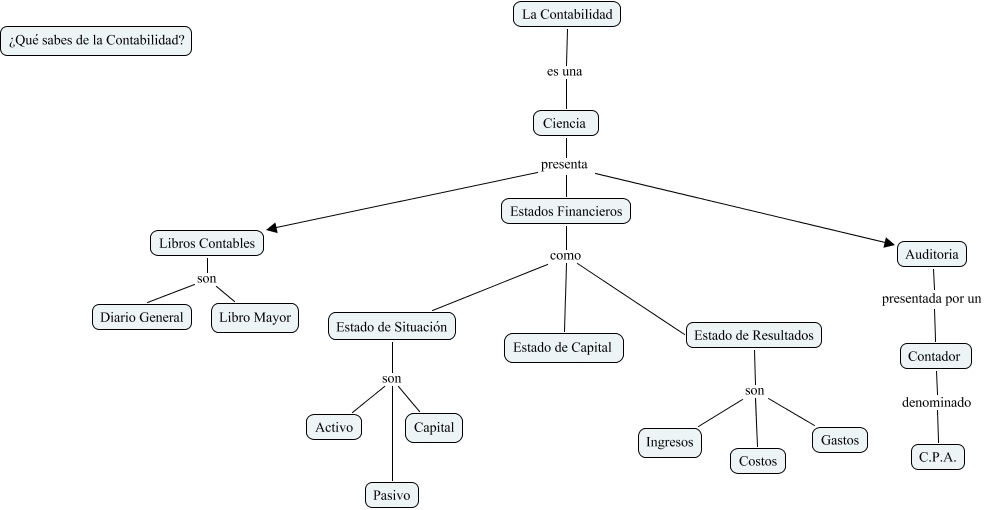 Este Cmap, tiene información relacionada con: contabilidad, Contador denominado C.P.A., Estados Financieros como Estado de Situación, Estado de Resultados son Costos, La Contabilidad es una Ciencia, Auditoria presentada por un Contador, Ciencia presenta Auditoria, Estado de Situación son Capital, Ciencia presenta Estados Financieros, Estados Financieros como Estado de Capital, Estado de Resultados son Gastos, Estados Financieros como Estado de Resultados, Ciencia presenta Libros Contables, Estado de Resultados son Ingresos, Estado de Situación son Pasivo, Libros Contables son Diario General, Libros Contables son Libro Mayor, Estado de Situación son Activo