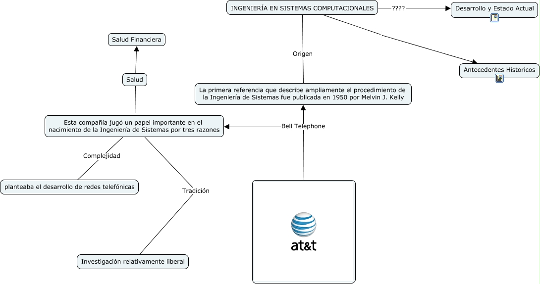Este Cmap, tiene información relacionada con: Ing. en Sistemas computacionales, Bell Telephone La primera referencia que describe ampliamente el procedimiento de la Ingeniería de Sistemas fue publicada en 1950 por Melvin J. Kelly, Esta compañía jugó un papel importante en el nacimiento de la Ingeniería de Sistemas por tres razones Complejidad planteaba el desarrollo de redes telefónicas, Bell Telephone Esta compañía jugó un papel importante en el nacimiento de la Ingeniería de Sistemas por tres razones, INGENIERÍA EN SISTEMAS COMPUTACIONALES Origen La primera referencia que describe ampliamente el procedimiento de la Ingeniería de Sistemas fue publicada en 1950 por Melvin J. Kelly, Esta compañía jugó un papel importante en el nacimiento de la Ingeniería de Sistemas por tres razones Tradición Investigación relativamente liberal, INGENIERÍA EN SISTEMAS COMPUTACIONALES ???? Desarrollo y Estado Actual, Esta compañía jugó un papel importante en el nacimiento de la Ingeniería de Sistemas por tres razones ???? Salud Financiera, INGENIERÍA EN SISTEMAS COMPUTACIONALES Antecedentes Historicos