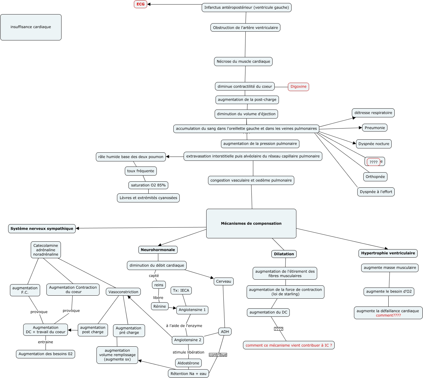 Cette carte de concepts créée avec IHMC CmapTools traite de: ic final, augmentation F.C. provoque Augmentation DC + travail du coeur, Neurohormonale ???? diminution du débit cardiaque, augmente le besoin d'O2 ???? augmente masse musculaire, Tx: IECA ???? Angiotensine 1, augmentation du DC ???? comment ce mécanisme vient contribuer à IC ?, Mécanismes de compensation ???? Système nerveux sympathique, accumulation du sang dans l'oreillette gauche et dans les veines pulmonaires ???? Pneumonie, Digoxine ???? diminue contractilité du coeur, diminution du débit cardiaque ???? Cerveau, Nécrose du muscle cardiaque ???? diminue contractilité du coeur, Digoxine ???? diminue contractilité du coeur, diminution du volume d'éjection ???? augmentation de la pression pulmonaire, Augmentation Contraction du coeur provoque Augmentation DC + travail du coeur, Rétention Na + eau ???? augmentation volume remplissage (augmente sx), congestion vasculaire et oedème pulmonaire Mécanismes de compensation, extravasation interstitielle puis alvéolaire du réseau capillaire pulmonaire ???? râle humide base des deux poumon, Vasoconstriction ???? augmentation post charge, accumulation du sang dans l'oreillette gauche et dans les veines pulmonaires ???? ????, diminue contractilité du coeur ???? augmentation de la post-charge, Augmentation pré charge ???? augmentation volume remplissage (augmente sx)