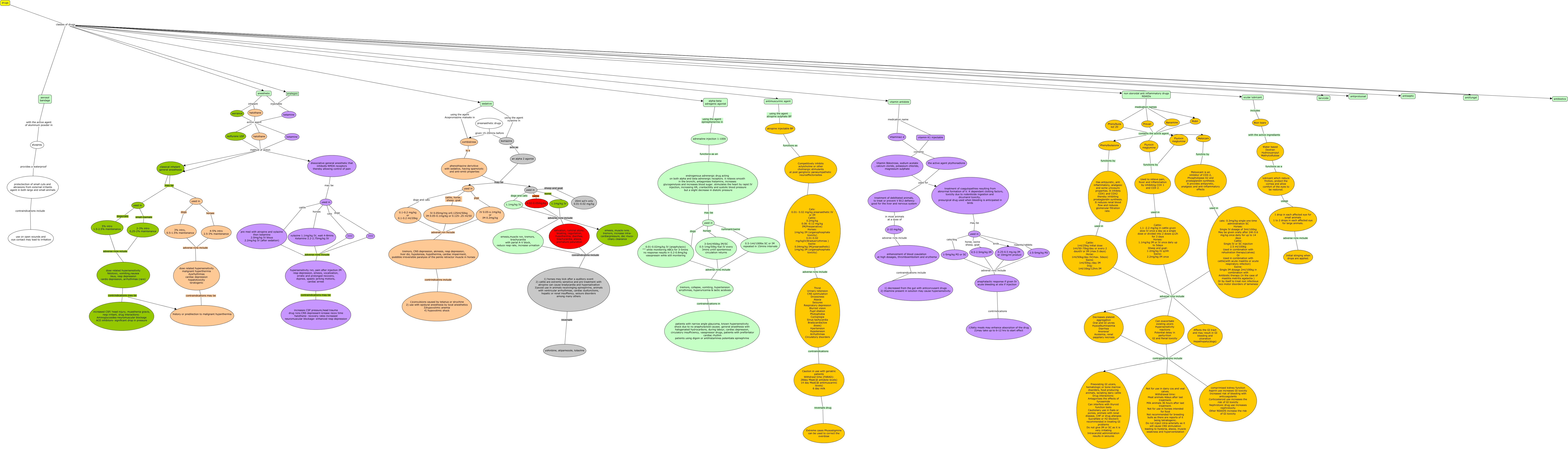 This Concept Map, created with IHMC CmapTools, has information related to: lecture 1 drugs, Cattle: 1ml/25kg initial dose 1ml/50-70kg/day or every 2 daysIV or IM (max.5 days) Horse: 1ml/50kg/day IV(max. 5days) Swine: 1ml/50kg /day IM Dog: 1ml/16kg/12hrs IM adverse rzns include Affects the GI tract and may result in GI bleeding and ulceration Hepathopaty(dogs), drugs classes of drugs antifungal, preanasthetic drugs given 15-20mins before combistress, vitamin K1 injectable contains Vitamin Bdextrose, sodium acetate , calcium cloride, potassium chloride, magnesium sulphate, anesthetic inhalant aerrance, used in horses 3-5ml/450kg IM/SC 0.5-1mg/50kg foal IV every 3mins untill spontenious circulation returns, Prevail contains the active agent Phenylbutazone, isoflurane USP method of action classical inhalant general anesthesia, 0.02-0.05mg/kg adverse rxns include emesis,muscle rxn, tremors, brachycardia with parial A-V block, reduce resp rate, increase urination, an alpha 2 agonist may be used in, used in small mamals 2-3% intro 0,25-2% maintenance, drugs classes of drugs analegsic, drugs classes of drugs antimuscurinic agent, Cattle: 1.1 -2.2 mg/kg in cattle given slow IV once a day as a single dose or divided into 2 doses q12h for 3 days Horses: 1.1mg/kg IM or IV once daily up to 5days Sheep and goat: 1-2mg/kg IV q24h Swine: 2.2mg/kg IM once adverse rzns include Decreases platelet aggregation Oral and GI ulcres Hypoalbuminaemia Diarrhea Anorexia’ Azotemia, renal pappilary necrosis, emesis,muscle rxn, tremors, brachycardia with parial A-V block, reduce resp rate, increase urination conraindicatins include 1) horses may kick after a auditory event 2) cattle are extremly sensitive and pre treatment with atropine can cause bradycardia and hypersalivation 3)avoid use in animals receivinging epinephrine, animals with ventricular arrhythmias, cardiac dysfunctions, hepatic or renal insuffiency, seizure disorders among many others, an alpha 2 agonist may be used in, drugs classes of drugs ocular lubricant, cats: 0.3mg/kg single one time administration SC Horses: Single IV dosage of 3ml/100kg May be given orally after 24h 0.6 mg/kg once daily for up to 14 days Cattle: Single IV or SC injection 2.5 ml/100kg Used in combination with rehydration therapy(calves) Or Used in combination with cattle(with acute mastitis or acute respiratory infection) Swine: Single IM dosage 2ml/100kg in combination with Antibiotic therapy (in the case of mastitis metritis agalactia ) Or by itself to treat non infectious loco motor disorders of lameness adverse rzns include Decreases platelet aggregation Oral and GI ulcres Hypoalbuminaemia Diarrhea Anorexia’ Azotemia, renal pappilary necrosis, Has antipyretic, anti inflammatory, analgesic and some uricosuric properties. It inhibits COX1 and COX2 thereby inhibiting prostaglandin synthesis. It reduces renal blood flow and reduces glomerular filtration rate. used in Cattle: 1ml/25kg initial dose 1ml/50-70kg/day or every 2 daysIV or IM (max.5 days) Horse: 1ml/50kg/day IV(max. 5days) Swine: 1ml/50kg /day IM Dog: 1ml/16kg/12hrs IM, ketamine active agent ketamine