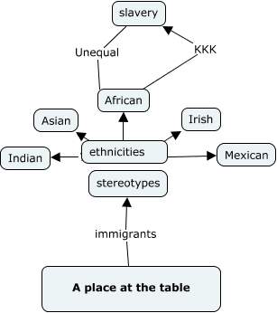 This Concept Map, created with IHMC CmapTools, has information related to: A place at the table, slavery Unequal African, ethnicities ???? Mexican, A place at the table immigrants stereotypes, ethnicities ???? Asian, ethnicities African, ethnicities ???? Indian, ethnicities ???? Irish, African KKK slavery, ethnicities African
