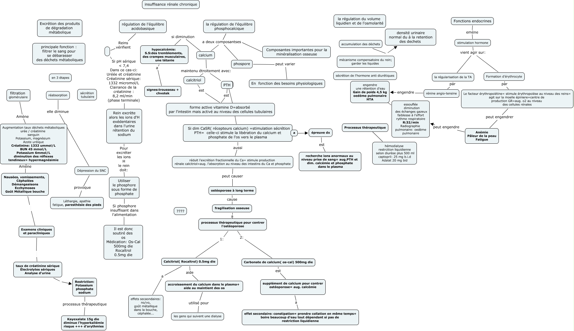 Cette carte de concepts créée avec IHMC CmapTools traite de: insuffisance rénale, calcium maintenu étroitement avec: calcitriol, calcitriol est forme active vitamine D=absorbé par l'intestin mais activé au niveau des cellules tubulaires, ostéoporose à long terme cause fragilisation osseuse, filtration glomérulaire Amène Augmentation taux déchets métaboliques urée / créatinine sanguin Potassium, magnésium Azote uréique Créatinine: 1332 ummol/L BUN 45 mmol/L Potassium 6mmol/L diminution des réflexes tendineux= hypermagnésimie, taux de créatinine sérique Électrolytes sériques Analyse d'urine Restriction: Potassium phosphate sodium, Formation d'érythrocyte par Le facteur érythropoiétine= stimule érythropoièse au niveau des reins= agit sur la moelle épiniere=centre de production GR=aug. o2 au niveau des cellules rénales, Calcitriol( Rocaltrol) 0.5mg die a effets secaondaires: no/vo, goût métallique dans la bouche, céphalée..., Le facteur érythropoiétine= stimule érythropoièse au niveau des reins= agit sur la moelle épiniere=centre de production GR=aug. o2 au niveau des cellules rénales peut engendrer Anémie Pâleur de la peau Fatigue, épreuve dx est recherche ions anormaux au niveau prise de sang= aug.PTH et dim. calcémie et phosphate dans le plasma, processus thérapeutique pour contrer l'ostéoporose 1: Calcitriol( Rocaltrol) 0.5mg die, accroissement du calcium dans le plasma+ aide au maintient des os utilisé pour les gens qui suivent une dialyse, réduit l'excrétion fractionnelle du Ca= stimule production rénale calcitriol=aug. l'absorption au niveau des intestins du Ca et phosphate peut causer ostéoporose à long terme, Si dim CaSR( récepteurs calcium) =stimulation sécrétion PTH= celle-ci stimule la libération du calcium et phosphate de l'os vers le plasma aussi réduit l'excrétion fractionnelle du Ca= stimule production rénale calcitriol=aug. l'absorption au niveau des intestins du Ca et phosphate, Si pH sérique < 7,4 Dans ce cas-ci: Uréée et créatinine Créatinine sérique: 1332 micromol/L Clairance de la créatinine : 8,2 ml/min (phase terminale) Rein excrète alors les ions d'H exédentaires dans l'urine rétention du sodium, Calcitriol( Rocaltrol) 0.5mg die aide accroissement du calcium dans le plasma+ aide au maintient des os, rénine angio-tensine engendre engendre une rétention d'eau Gain de poids 4,5 kg oedéme pulmonaire HTA, processus thérapeutique pour contrer l'ostéoporose 2: Carbonate de calcium( os-cal) 500mg die, Carbonate de calcium( os-cal) 500mg die est supplément de calcium pour contrer ostéoporose= aug. calcémie, accumulation des déchets densité urinaire normal du à la retention des dechets, fragilisation osseuse a processus thérapeutique pour contrer l'ostéoporose