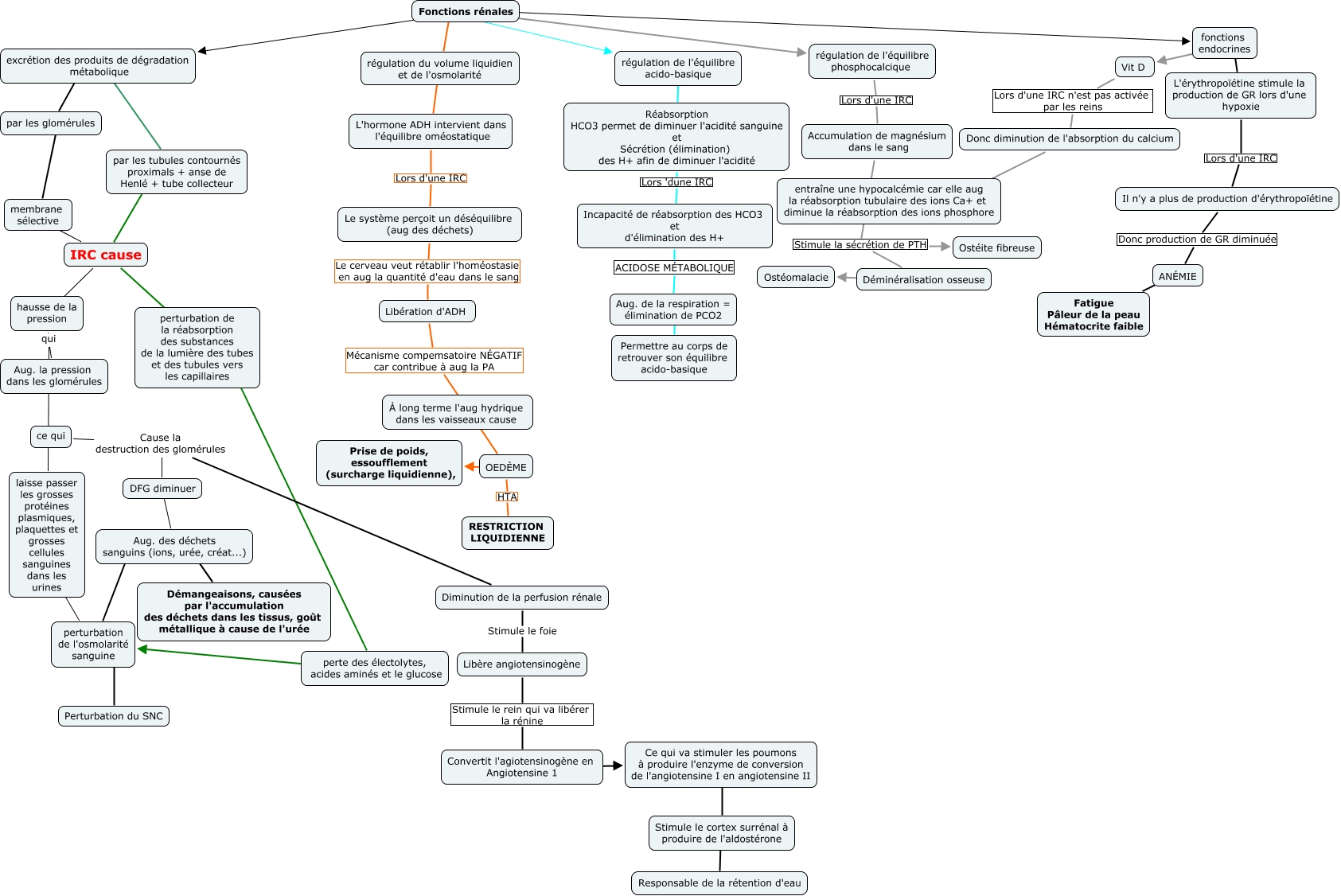 Cette carte de concepts créée avec IHMC CmapTools traite de: IR, OEDÈME HTA RESTRICTION LIQUIDIENNE, fonctions endocrines ???? Vit D, Libère angiotensinogène Stimule le rein qui va libérer la rénine Convertit l'agiotensinogène en Angiotensine 1, laisse passer les grosses protéines plasmiques, plaquettes et grosses cellules sanguines dans les urines ???? perturbation de l'osmolarité sanguine, Déminéralisation osseuse ???? Ostéomalacie, Il n'y a plus de production d'érythropoïétine Donc production de GR diminuée ANÉMIE, régulation de l'équilibre phosphocalcique Lors d'une IRC Accumulation de magnésium dans le sang, régulation du volume liquidien et de l'osmolarité ???? L'hormone ADH intervient dans l'équilibre oméostatique, Aug. de la respiration = élimination de PCO2 ???? Permettre au corps de retrouver son équilibre acido-basique, hausse de la pression qui laisse passer les grosses protéines plasmiques, plaquettes et grosses cellules sanguines dans les urines, ce qui Cause la destruction des glomérules Diminution de la perfusion rénale, Fonctions rénales régulation de l'équilibre phosphocalcique, Incapacité de réabsorption des HCO3 et d'élimination des H+ ACIDOSE MÉTABOLIQUE Aug. de la respiration = élimination de PCO2, fonctions endocrines ???? L'érythropoïétine stimule la production de GR lors d'une hypoxie, L'érythropoïétine stimule la production de GR lors d'une hypoxie Lors d'une IRC Il n'y a plus de production d'érythropoïétine, Réabsorption HCO3 permet de diminuer l'acidité sanguine et Sécrétion (élimination) des H+ afin de diminuer l'acidité Lors 'dune IRC Incapacité de réabsorption des HCO3 et d'élimination des H+, par les glomérules ???? membrane sélective, perturbation de l'osmolarité sanguine ???? Perturbation du SNC, Stimule le cortex surrénal à produire de l'aldostérone ???? Responsable de la rétention d'eau, Fonctions rénales ???? excrétion des produits de dégradation métabolique