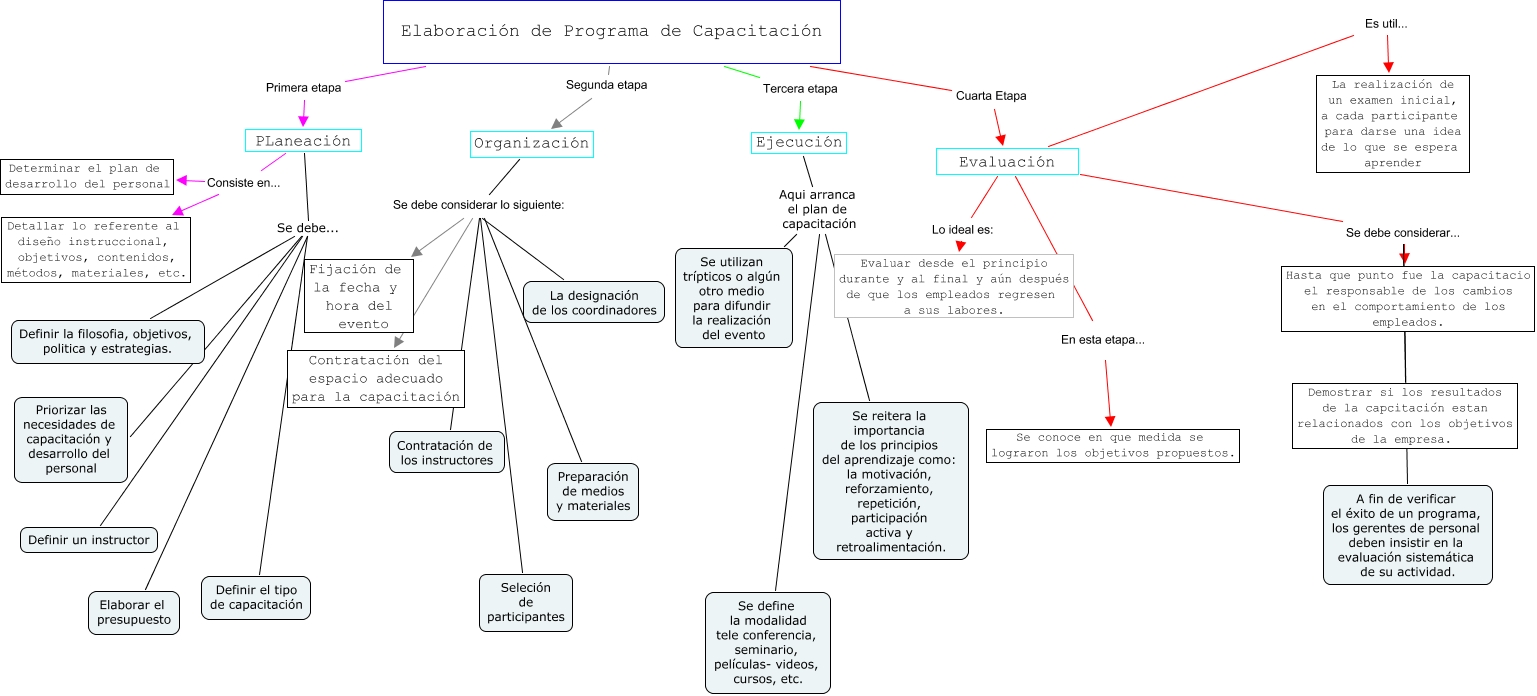 Este Cmap, tiene información relacionada con: PISO TERMICO, Organización Se debe considerar lo siguiente: Fijación de la fecha y hora del evento, PLaneación Se debe... Priorizar las necesidades de capacitación y desarrollo del personal, PLaneación Consiste en... Determinar el plan de desarrollo del personal, PLaneación Consiste en... Detallar lo referente al diseño instruccional, objetivos, contenidos, métodos, materiales, etc., Elaboración de Programa de Capacitación Tercera etapa Ejecución, Elaborar el presupuesto Se debe... Definir la filosofia, objetivos, politica y estrategias., PLaneación Se debe... Definir la filosofia, objetivos, politica y estrategias., Ejecución Aqui arranca el plan de capacitación Se utilizan trípticos o algún otro medio para difundir la realización del evento, Preparación de medios y materiales Se debe considerar lo siguiente: Contratación del espacio adecuado para la capacitación, Evaluación Se debe considerar... Hasta que punto fue la capacitacio el responsable de los cambios en el comportamiento de los empleados., A fin de verificar el éxito de un programa, los gerentes de personal deben insistir en la evaluación sistemática de su actividad. Se debe considerar... Hasta que punto fue la capacitacio el responsable de los cambios en el comportamiento de los empleados., Evaluación Lo ideal es: Evaluar desde el principio durante y al final y aún después de que los empleados regresen a sus labores., Organización Se debe considerar lo siguiente: Contratación del espacio adecuado para la capacitación, Se define la modalidad tele conferencia, seminario, películas- videos, cursos, etc. Aqui arranca el plan de capacitación Se utilizan trípticos o algún otro medio para difundir la realización del evento, Definir un instructor Se debe... Definir la filosofia, objetivos, politica y estrategias., La designación de los coordinadores Se debe considerar lo siguiente: Fijación de la fecha y hora del evento, Elaboración de Programa de Capacitación Primera etapa PLaneación, Contratación de los instructores Se debe considerar lo siguiente: Contratación del espacio adecuado para la capacitación, Preparación de medios y materiales Se debe considerar lo siguiente: Fijación de la fecha y hora del evento, Definir el tipo de capacitación Se debe... Definir la filosofia, objetivos, politica y estrategias.