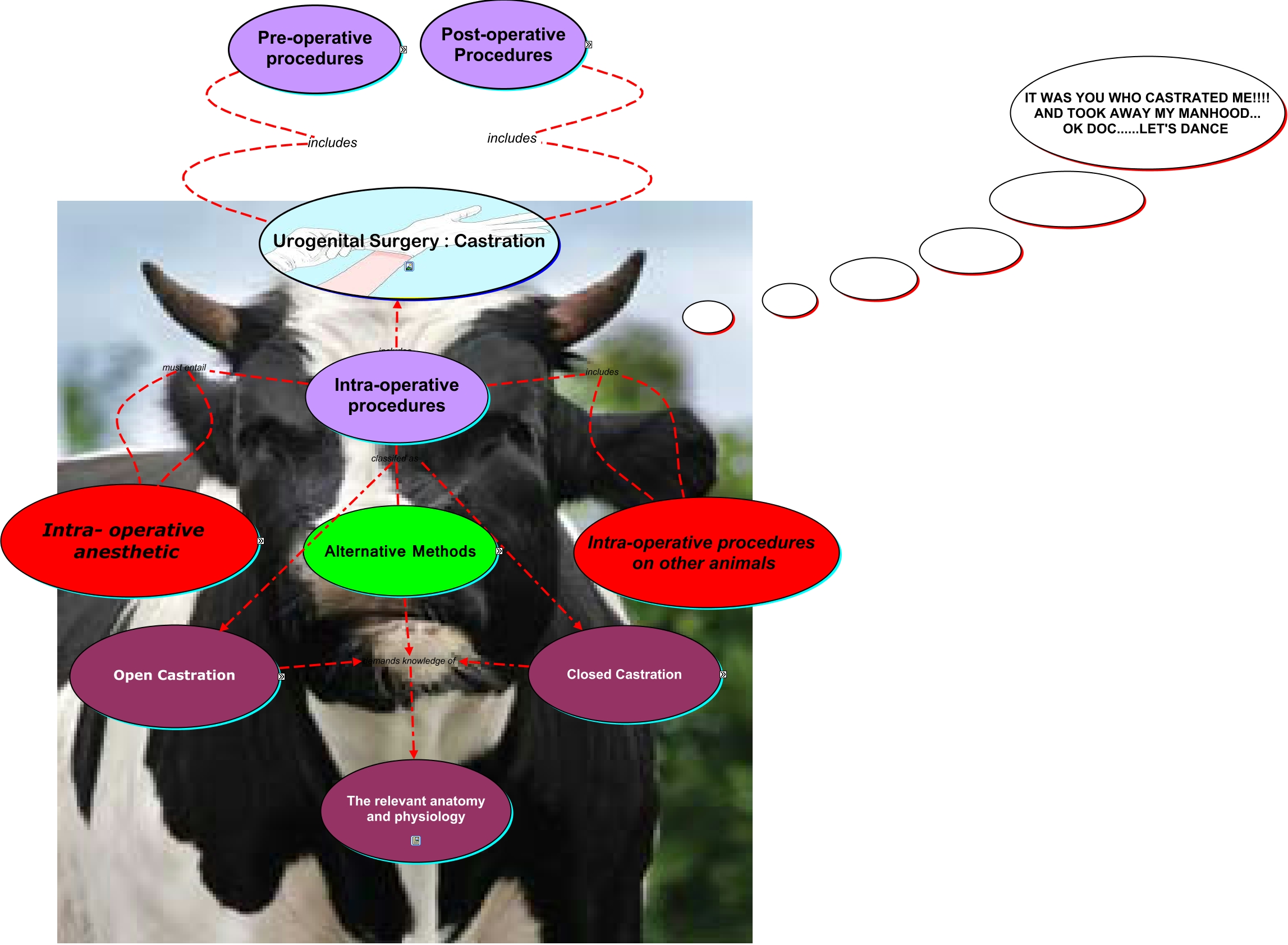 This Concept Map, created with IHMC CmapTools, has information related to: LAS 3 Cmap, Open - open castration without incising the vaginal tunic Open- closed castration, general physical exam includes anesthetics to be applied, Open - open castration general details Complications, client education includes anesthetics to be applied, Alternative Methods demands knowledge of The relevant anatomy and physiology, Suitable method considers Pre-anesthetic assesment, cattle performed in open-closed castration, SWINE questions frequently asked Why are they castrated?, cattle consist of Intra-operative procedures, open-closed castration which can include Open castrations, restraint includes Pre-operative, Complications can be corrected by Scrotal hernia repair, Open - open castration general details Precautions, Observations includes Post-operative Procedures, Advantages Considers Closed castrations, 1)treat animal based on signs 2) re-evaluate surgery plan 3)formulate next step toward treating the animals then abnormal, distance examination includes Pre-operative, Complications which requires general info such as SWINE, local anesthsia may include the use of Closed castrations, Intra-operative procedures includes Intra-operative procedures on other animals