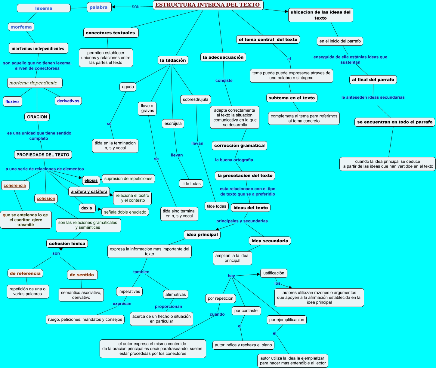 Este Cmap, tiene información relacionada con: mapa conseptual de excell, por repeticion cuando el autor expresa el mismo contenido de la oración principal es decir parafraseando, suelen estar procedidas por los conectores, aguda se tilda en la terminacion n, s y vocal, amplían la la idea principal hay por repeticion, ORACION es una unidad que tiene sentido completo PROPIEDADS DEL TEXTO, morfema dependiente ???? derivativos, al final del parrafo le anteseden ideas secundarias se encuentran en todo el parrafo, de referencia ???? repetición de una o varias palabras, corrección gramatical la buena ortografía la presetacion del texto, la presetacion del texto esta relacionado con el tipo de texto que se a preferidio ideas del texto, dexis ???? señala doble enuciado, expresa la informacion mas importante del texto tambien imperativas, PROPIEDADS DEL TEXTO a una serie de relaciones de elementos coherencia, la tildación ???? esdrújula, conectores textuales ???? ESTRUCTURA INTERNA DEL TEXTO, son las relaciones gramaticales y semánticas son de sentido, esdrújula llevan tilde todas, llave o graves se tilda sino termina en n, s y vocal, se encuentran en todo el parrafo ???? cuando la idea principal se deduce a partir de las ideas que han vertidoe en el texto, morfema multiplicar morfemas independientes, ESTRUCTURA INTERNA DEL TEXTO ???? la adecuacuación