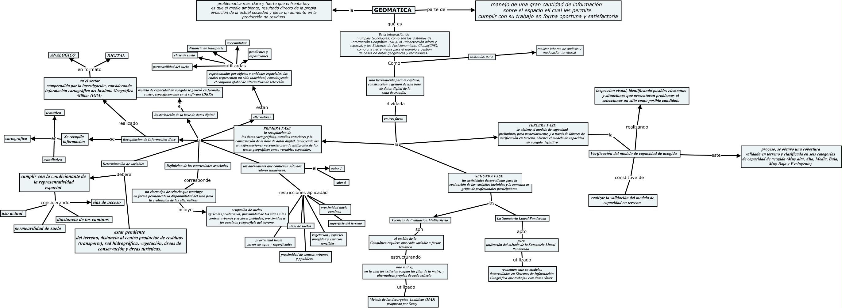 Este Cmap, tiene información relacionada con: archivos, para utilización del método de la Sumatoria Lineal Ponderada utilizado recuentemente en modelos desarrollados en Sistemas de Información Geográfica que trabajan con datos ráster, PRIMERA FASE la recopilación de los datos cartográficos, estudios anteriores y la construcción de la base de datos digital, incluyendo las transformaciones necesarias para la utilización de los temas geográficos como variables espaciales. la Definición de las restricciones asociadas, SEGUNDA FASE las actividades desarrolladas para la evaluación de las variables incluidas y la consulta al grupo de profesionales participantes las Técnicas de Evaluación Multicriterio, representadas por objetos o unidades espaciales, las cuales representan un sitio individual, constituyendo el conjunto global de alternativas de selección utilizadas accesibilidad, GEOMATICA la problematica más clara y fuerte que enfrenta hoy es que el medio ambiente, resultado directo de la propia evolución de la actual sociedad y eleva un aumento en la producción de residuos, PRIMERA FASE la recopilación de los datos cartográficos, estudios anteriores y la construcción de la base de datos digital, incluyendo las transformaciones necesarias para la utilización de los temas geográficos como variables espaciales. la las alternativas que contienen sólo dos valores numéricos:, una herramienta para la captura, construcción y gestión de una base de datos digital de la zona de estudio. dividada en tres faces, representadas por objetos o unidades espaciales, las cuales representan un sitio individual, constituyendo el conjunto global de alternativas de selección utilizadas permeavilidad del suelo, Verificación del modelo de capacidad de acogida este proceso, se obtuvo una cobertura validada en terreno y clasificada en seis categorías de capacidad de acogida (Muy alta, Alta, Media, Baja, Muy Baja y Excluyente), Se recopiló información en tematica, SEGUNDA FASE las actividades desarrolladas para la evaluación de las variables incluidas y la consulta al grupo de profesionales participantes las La Sumatoria Lineal Ponderada, las alternativas que contienen sólo dos valores numéricos: restricciones aplicadad vegetacion , especies prtegidad y espacios sencibles, La Sumatoria Lineal Ponderada apto para utilización del método de la Sumatoria Lineal Ponderada, Se recopiló información en cartografica, el ámbito de la Geomática requiere que cada variable o factor temático estructurando una matriz, en la cual los criterios ocupan las filas de la matriz y alternativas propias de cada criterio, un cierto tipo de criterio que restringe en forma permanente la disponibilidad del sitio para la evaluación de las alternativas incluye ocupación de suelos agrícolas productivos, proximidad de los sitios a los centros urbanos y sectores poblados, proximidad a los caminos y superficie del terreno, GEOMATICA parte de manejo de una gran cantidad de información sobre el espacio ell cual les permite cumplir con su trabajo en forma oportuna y satisfactoria, cumplir con la condicionante de la representatividad espacial considerando uso actual, representadas por objetos o unidades espaciales, las cuales representan un sitio individual, constituyendo el conjunto global de alternativas de selección utilizadas pendientes y esposiciones, PRIMERA FASE la recopilación de los datos cartográficos, estudios anteriores y la construcción de la base de datos digital, incluyendo las transformaciones necesarias para la utilización de los temas geográficos como variables espaciales. la alternativas