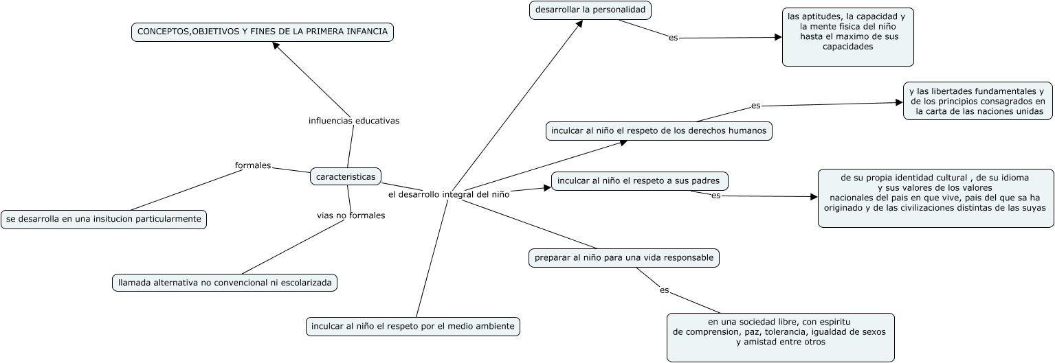 This Concept Map, created with IHMC CmapTools, has information related to: conosimiento, desarrollar la personalidad es las aptitudes, la capacidad y la mente fisica del niño hasta el maximo de sus capacidades, caracteristicas influencias educativas CONCEPTOS,OBJETIVOS Y FINES DE LA PRIMERA INFANCIA, caracteristicas el desarrollo integral del niño inculcar al niño el respeto por el medio ambiente, preparar al niño para una vida responsable es en una sociedad libre, con espiritu de comprension, paz, tolerancia, igualdad de sexos y amistad entre otros, caracteristicas el desarrollo integral del niño desarrollar la personalidad, caracteristicas el desarrollo integral del niño preparar al niño para una vida responsable, caracteristicas vias no formales llamada alternativa no convencional ni escolarizada, caracteristicas el desarrollo integral del niño inculcar al niño el respeto a sus padres, caracteristicas formales se desarrolla en una insitucion particularmente, inculcar al niño el respeto a sus padres es de su propia identidad cultural , de su idioma y sus valores de los valores nacionales del pais en que vive, pais del que sa ha originado y de las civilizaciones distintas de las suyas, inculcar al niño el respeto de los derechos humanos es y las libertades fundamentales y de los principios consagrados en la carta de las naciones unidas, caracteristicas el desarrollo integral del niño inculcar al niño el respeto de los derechos humanos