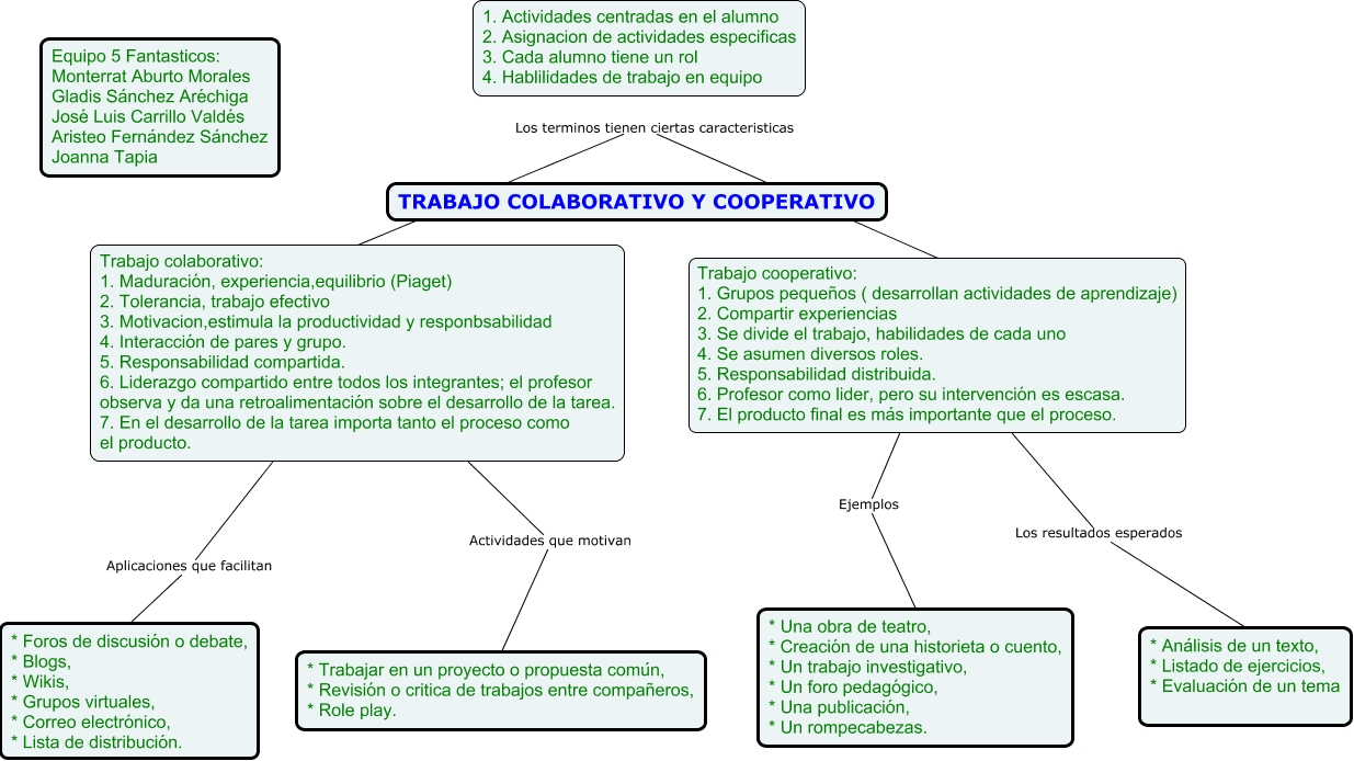 Este Cmap, tiene información relacionada con: Equipo 5 Fantasticos, Trabajo colaborativo: 1. Maduración, experiencia,equilibrio (Piaget) 2. Tolerancia, trabajo efectivo 3. Motivacion,estimula la productividad y responbsabilidad 4. Interacción de pares y grupo. 5. Responsabilidad compartida. 6. Liderazgo compartido entre todos los integrantes; el profesor observa y da una retroalimentación sobre el desarrollo de la tarea. 7. En el desarrollo de la tarea importa tanto el proceso como el producto. Actividades que motivan * Trabajar en un proyecto o propuesta común, * Revisión o critica de trabajos entre compañeros, * Role play., Trabajo cooperativo: 1. Grupos pequeños ( desarrollan actividades de aprendizaje) 2. Compartir experiencias 3. Se divide el trabajo, habilidades de cada uno 4. Se asumen diversos roles. 5. Responsabilidad distribuida. 6. Profesor como lider, pero su intervención es escasa. 7. El producto final es más importante que el proceso. Los resultados esperados * Análisis de un texto, * Listado de ejercicios, * Evaluación de un tema, Trabajo cooperativo: 1. Grupos pequeños ( desarrollan actividades de aprendizaje) 2. Compartir experiencias 3. Se divide el trabajo, habilidades de cada uno 4. Se asumen diversos roles. 5. Responsabilidad distribuida. 6. Profesor como lider, pero su intervención es escasa. 7. El producto final es más importante que el proceso. Ejemplos * Una obra de teatro, * Creación de una historieta o cuento, * Un trabajo investigativo, * Un foro pedagógico, * Una publicación, * Un rompecabezas., Trabajo colaborativo: 1. Maduración, experiencia,equilibrio (Piaget) 2. Tolerancia, trabajo efectivo 3. Motivacion,estimula la productividad y responbsabilidad 4. Interacción de pares y grupo. 5. Responsabilidad compartida. 6. Liderazgo compartido entre todos los integrantes; el profesor observa y da una retroalimentación sobre el desarrollo de la tarea. 7. En el desarrollo de la tarea importa tanto el proceso como el producto. Los terminos tienen ciertas caracteristicas Trabajo cooperativo: 1. Grupos pequeños ( desarrollan actividades de aprendizaje) 2. Compartir experiencias 3. Se divide el trabajo, habilidades de cada uno 4. Se asumen diversos roles. 5. Responsabilidad distribuida. 6. Profesor como lider, pero su intervención es escasa. 7. El producto final es más importante que el proceso., Trabajo colaborativo: 1. Maduración, experiencia,equilibrio (Piaget) 2. Tolerancia, trabajo efectivo 3. Motivacion,estimula la productividad y responbsabilidad 4. Interacción de pares y grupo. 5. Responsabilidad compartida. 6. Liderazgo compartido entre todos los integrantes; el profesor observa y da una retroalimentación sobre el desarrollo de la tarea. 7. En el desarrollo de la tarea importa tanto el proceso como el producto. Aplicaciones que facilitan * Foros de discusión o debate, * Blogs, * Wikis, * Grupos virtuales, * Correo electrónico, * Lista de distribución.