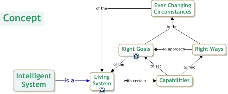 This Concept Map, created with IHMC CmapTools, has information related to: Intelligent System, Capabilities to find Right Ways, Capabilities to set Right Goals, Right Goals of the Living System, Intelligent System is a Living System, Living System with certain Capabilities, Right Ways in the Ever Changing Circumstances, Ever Changing Circumstances of the Living System, Right Ways to approach Right Goals, Right Goals in the Ever Changing Circumstances