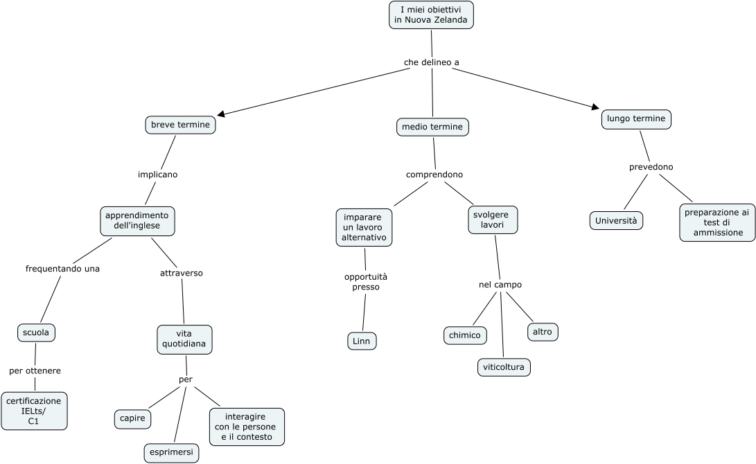 Questa Cmap, creata con IHMC CmapTools, contiene informazioni relative a: Obiettivi, I miei obiettivi in Nuova Zelanda che delineo a breve termine, I miei obiettivi in Nuova Zelanda che delineo a lungo termine, breve termine implicano apprendimento dell'inglese, svolgere lavori nel campo viticoltura, svolgere lavori nel campo chimico, svolgere lavori nel campo altro, scuola per ottenere certificazione IELts/ C1, apprendimento dell'inglese frequentando una scuola, vita quotidiana per capire, apprendimento dell'inglese attraverso vita quotidiana, medio termine comprendono svolgere lavori, medio termine comprendono imparare un lavoro alternativo, lungo termine prevedono preparazione ai test di ammissione, lungo termine prevedono Università, I miei obiettivi in Nuova Zelanda che delineo a medio termine, imparare un lavoro alternativo opportuità presso Linn, vita quotidiana per interagire con le persone e il contesto, vita quotidiana per esprimersi