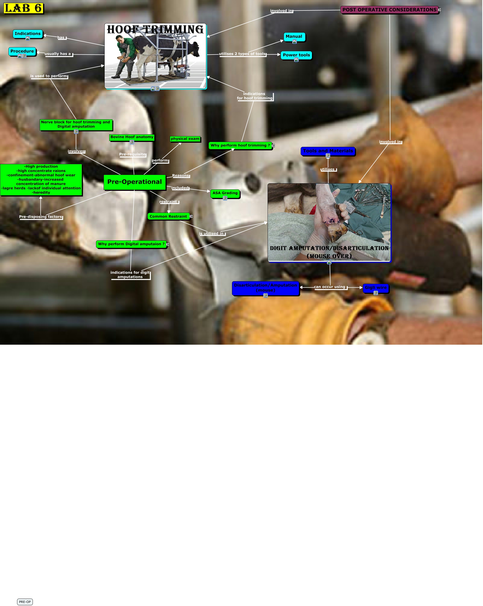This Concept Map, created with IHMC CmapTools, has information related to: LAB 6 FINAL, DIGIT AMPUTATION/DISARTICULATION (MOUSE OVER) can occur using Gigli wire, Pre-Operational Reasons A cow with painful feet or lameness is less likely to walk, and therefore less likely to have desire to eat which will reduce weight gain or milk production comapared to an animal able to consume full ration of feed. See attached PNG. for lameness grading, POST OPERATIVE CONSIDERATIONS of Amputaion and Disarticulation (mouse over), Why perform Digital amputaion ? indications for digit amputations DIGIT AMPUTATION/DISARTICULATION (MOUSE OVER), DIGIT AMPUTATION/DISARTICULATION (MOUSE OVER) utilises Tools and Materials, POST OPERATIVE CONSIDERATIONS of Hoof Trimming, Hoof Trimming includes Monitor the patient for a few days after trimming to sure that no inflammation or lamness accurs, Pre-Operational included ASA Grading, Pre-Operational ???? -the aim of digit amputation is to relieve pain return the animal to sound gait and normal production, and to prevent infection ascending proximally in the limb, HOOF TRIMMING utilises 2 types of tools Manual, HOOF TRIMMING usually has a Procedure, POST OPERATIVE CONSIDERATIONS involved in HOOF TRIMMING, Pre-Operational Pre-disposing factors -High production -high concentrate raions -confinement-abnormal hoof wear -husbandary-increased concentration of manure -lagre herds -lackof individual attention -heredity, Pre-Operational involves Nerve block for hoof trimming and Digital amputation, Amputaion and Disarticulation (mouse over) includes Client Information, Nerve block for hoof trimming and Digital amputation is used to perform HOOF TRIMMING, HOOF TRIMMING utilises 2 types of tools Power tools, POST OPERATIVE CONSIDERATIONS involved in DIGIT AMPUTATION/DISARTICULATION (MOUSE OVER), Common Restraint is utilised in DIGIT AMPUTATION/DISARTICULATION (MOUSE OVER), Why perform hoof trimming ? indications for hoof trimming HOOF TRIMMING