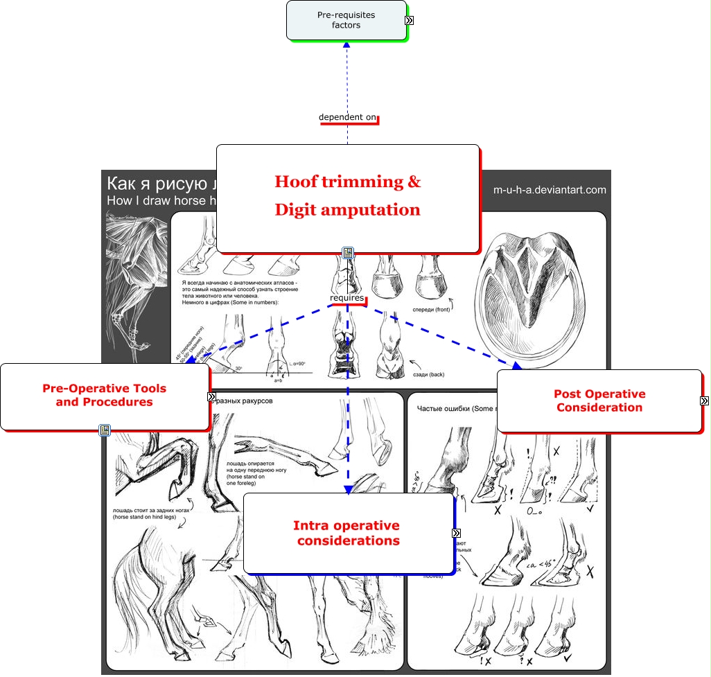 This Concept Map, created with IHMC CmapTools, has information related to: hoof trim & amputation FINAL, Post operative care should allow Control of pain/ inflammation, Hoof trimming & Digit amputation requires Pre-Operative Tools and Procedures, Complications associated with Infection, Restraint including Chemical, Xylazine hydrochloride administration via Intravenous (jugular) injection (fast onset), Physical utilizing Halter, A preanesthetic entails application Precautions and complications, Observations involve review of skin sutures, Physcal exam entails observation of Body score condition ideal is 3, Advantages which include Cattle usually return to previous level of production, Physcal exam entails observation of Temperature - 37.8-39.2 Pulse- 40-80bpm Respiratory rate -15-30bpm, local anesthesia may include optic nerve injury, Pre and Post -operative Pharmaceutical drugs with witdrawal which include -Lidocaine 24hr milk, 1 day meat - xylazine 14days milk 48hrs meat -Flunixin 72hrs meat 4dys milk -penicillin 10dys in meat, small rumenants follows the following procedure, digital amputation has the following Advantages, Physical utilizing Man power, cattle using procedure (m.o), digital amputation has the following Disadvantages, Peri-operative monitoring then performance of the Intra-operative procedure, Bier's Block to perform Digital amputation (mouse over)