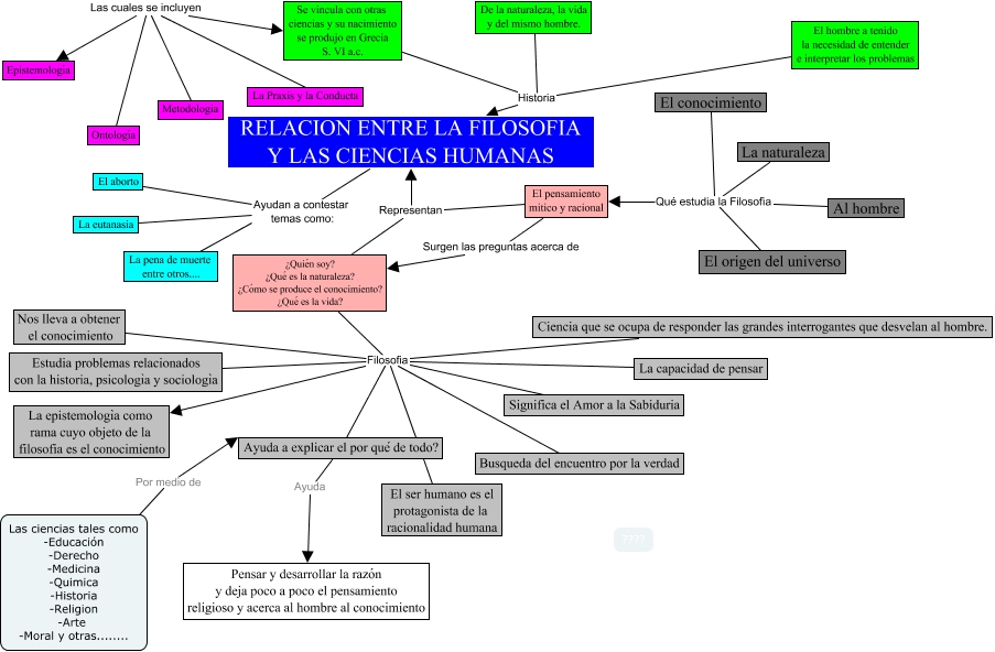 Este Cmap, tiene información relacionada con: RELACION ENTRE LA FILOSOFIA Y LAS CIENCIAS HUMANAS, ¿Quién soy? ¿Qué es la naturaleza? ¿Cómo se produce el conocimiento? ¿Qué es la vida? Representan RELACION ENTRE LA FILOSOFIA Y LAS CIENCIAS HUMANAS, Significa el Amor a la Sabiduria Filosofia La epistemologìa como rama cuyo objeto de la filosofia es el conocimiento, Nos lleva a obtener el conocimiento Filosofia La epistemologìa como rama cuyo objeto de la filosofia es el conocimiento, Ontología Las cuales se incluyen Metodologia, La capacidad de pensar Filosofia La epistemologìa como rama cuyo objeto de la filosofia es el conocimiento, La Praxis y la Conducta Las cuales se incluyen Epistemología, Busqueda del encuentro por la verdad Filosofia La epistemologìa como rama cuyo objeto de la filosofia es el conocimiento, El aborto Ayudan a contestar temas como: La eutanasia, El ser humano es el protagonista de la racionalidad humana Filosofia La epistemologìa como rama cuyo objeto de la filosofia es el conocimiento, El conocimiento Qué estudia la Filosofía El pensamiento mitico y racional, La Praxis y la Conducta Las cuales se incluyen Metodologia, Ciencia que se ocupa de responder las grandes interrogantes que desvelan al hombre. Filosofia La epistemologìa como rama cuyo objeto de la filosofia es el conocimiento, De la naturaleza, la vida y del mismo hombre. Historia RELACION ENTRE LA FILOSOFIA Y LAS CIENCIAS HUMANAS, ¿Quién soy? ¿Qué es la naturaleza? ¿Cómo se produce el conocimiento? ¿Qué es la vida? Filosofia La epistemologìa como rama cuyo objeto de la filosofia es el conocimiento, El hombre a tenido la necesidad de entender e interpretar los problemas Historia RELACION ENTRE LA FILOSOFIA Y LAS CIENCIAS HUMANAS, Ayuda a explicar el por qué de todo? Ayuda Pensar y desarrollar la razón y deja poco a poco el pensamiento religioso y acerca al hombre al conocimiento, El origen del universo Qué estudia la Filosofía El pensamiento mitico y racional, La naturaleza Qué estudia la Filosofía El pensamiento mitico y racional, Ontología Las cuales se incluyen Epistemología, Ayuda a explicar el por qué de todo? Filosofia La epistemologìa como rama cuyo objeto de la filosofia es el conocimiento