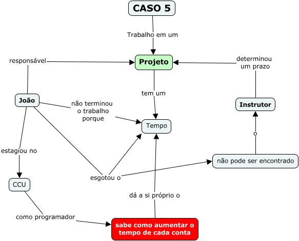 Esse mapa conceitual, produzido no IHMC CmapTools, tem a informação relacionada a: 4a semana - atividade - caso 5, João não terminou o trabalho porque Tempo, não pode ser encontrado o Instrutor, Instrutor determinou um prazo Projeto, João esgotou o Tempo, Projeto tem um Tempo, sabe como aumentar o tempo de cada conta dá a si próprio o Tempo, CCU como programador sabe como aumentar o tempo de cada conta, João esgotou o não pode ser encontrado, CASO 5 Trabalho em um Projeto, João estagiou no CCU, João responsável Projeto