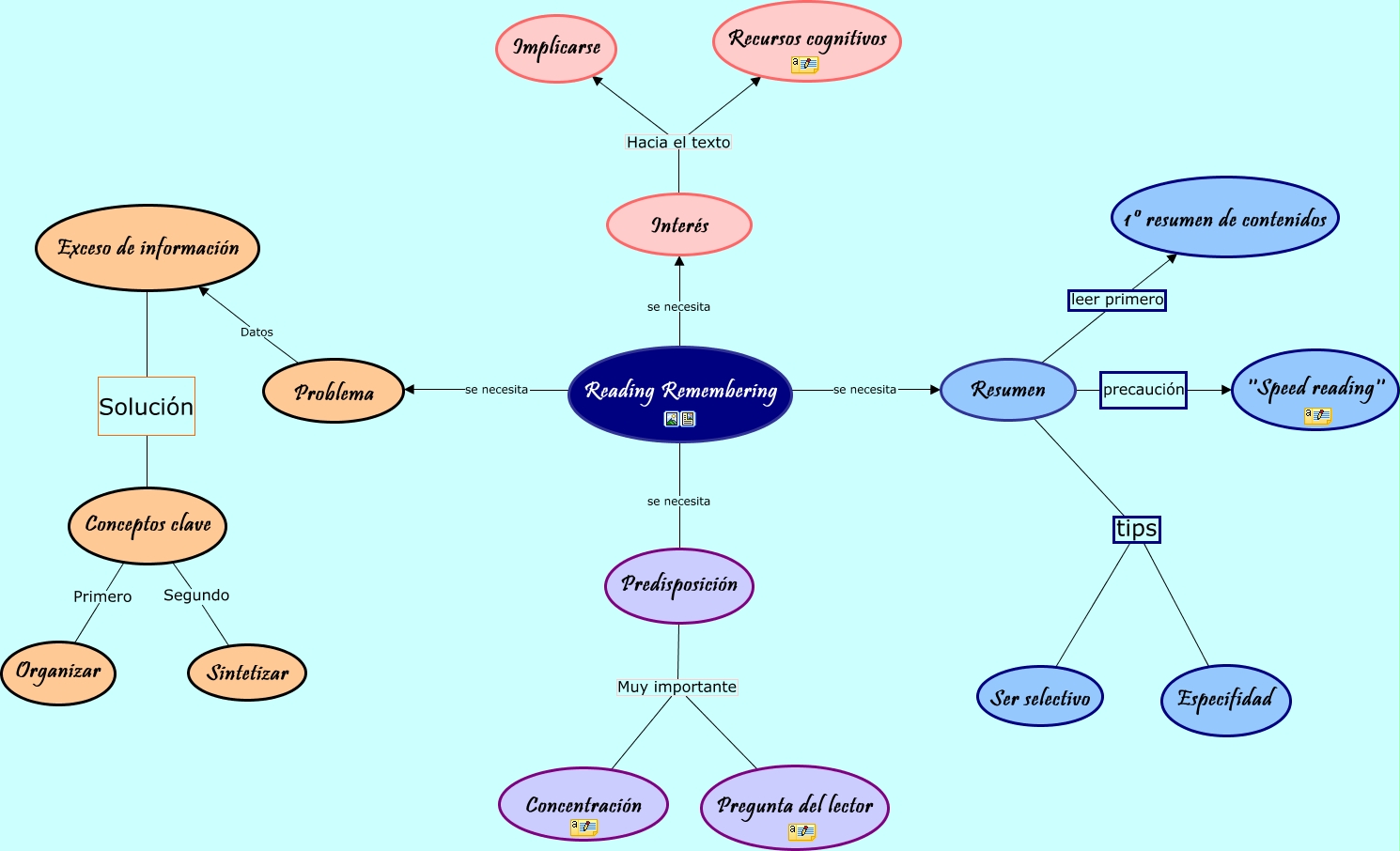 Este Cmap, tiene información relacionada con: Reading and Remembering, Predisposición Muy importante Pregunta del lector, Reading Remembering se necesita Problema, Predisposición Muy importante Concentración, Reading Remembering se necesita Interés, Resumen tips Ser selectivo, Reading Remembering se necesita Resumen, Resumen leer primero 1º resumen de contenidos, Resumen tips Especifidad, Interés Hacia el texto Recursos cognitivos, Conceptos clave Primero Organizar, Reading Remembering se necesita Predisposición, Interés Hacia el texto Implicarse, Conceptos clave Segundo Sintetizar, Resumen precaución ''Speed reading'', Exceso de información Solución Conceptos clave, Problema Datos Exceso de información