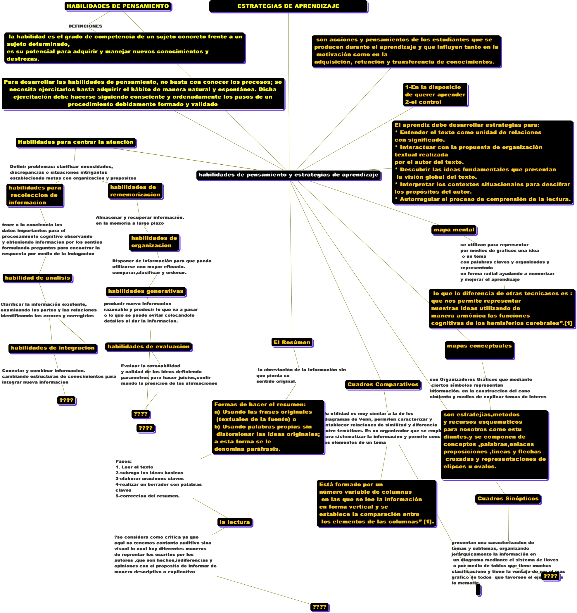 Este Cmap, tiene información relacionada con: aprendizaje autonomo aulas virtuales, la lectura ?se considera como critica ya que aqui no tenemos contanto auditivo sino visual lo cual hay diferentes maneras de reprentar los escritos por los autores ,que son hechos,indiferencias y opiniones con el proposito de informar de manera descriptiva o explicativa ????, habilidades de pensamiento y estrategias de aprendizaje ???? El Resúmen, habilidad de analisis Clarificar la información existente, examinando las partes y las relaciones identificando los errores y corregirlos habilidades de integracion, habilidades de pensamiento y estrategias de aprendizaje ???? mapa mental, Habilidades para centrar la atención Definir problemas: clarificar necesidades, discrepancias o situaciones intrigantes estableciendo metas con organizacion y propositos habilidades para recoleccion de informacion, Cuadros Comparativos Su utilidad es muy similar a la de los diagramas de Venn, permiten caracterizar y establecer relaciones de similitud y diferencia entre temáticas. Es un organizador que se emplea para sistematizar la informacion y permite constrastar los elementos de un tema, habilidades de pensamiento y estrategias de aprendizaje ???? Habilidades para centrar la atención, El Resúmen la abreviación de la información sin que pierda su sentido original. Formas de hacer el resumen: a) Usando las frases originales (textuales de la fuente) o b) Usando palabras propias sin distorsionar las ideas originales; a esta forma se le denomina paráfrasis., habilidades de pensamiento y estrategias de aprendizaje ???? El aprendiz debe desarrollar estrategias para: * Entender el texto como unidad de relaciones con significado. * Interactuar con la propuesta de organización textual realizada por el autor del texto. * Descubrir las ideas fundamentales que presentan la visión global del texto. * Interpretar los contextos situacionales para descifrar los propósitos del autor. * Autorregular el proceso de comprensión de la lectura., habilidades de pensamiento y estrategias de aprendizaje ???? HABILIDADES DE PENSAMIENTO, habilidades de integracion Conectar y combinar información. cambiando estructuras de conocimientos para integrar nueva informacion ????, habilidades para recoleccion de informacion traer a la conciencia los datos importantes para el procesamiento cognitivo observando y obteniendo informacion por los sentios formulando preguntas para encontrar la respuesta por medio de la indagacion habilidad de analisis, habilidades de evaluacion Evaluar la razonabilidad y calidad de las ideas definiendo parametros para hacer juicios,confir mando la presicion de las afirmaciones ????, Cuadros Sinópticos presentan una caracterización de temas y subtemas, organizando jerárquicamente la información en un diagrama mediante el sistema de llaves o por medio de tablas que tiene muchas clasificacione y tiene la ventaja de ser el mas grafico de todos que favorese el ejercicio de la memoria. ????, habilidad de analisis Clarificar la información existente, examinando las partes y las relaciones identificando los errores y corregirlos habilidades de integracion, habilidades de rememorizacion Almacenar y recuperar información. en la memoria a largo plazo habilidades de organizacion, habilidades de pensamiento y estrategias de aprendizaje ???? Cuadros Comparativos, mapa mental se utilizan para representar por medios de graficos una idea o un tema con palabras claves y organizadas y representada en forma radial ayudando a memorizar y mejorar el aprendizaje lo que lo diferencia de otras tecnicases es : que nos permite representar nuestras ideas utilizando de manera armónica las funciones cognitivas de los hemisferios cerebrales”.[1], habilidades generativas producir nueva informacion razonable y predecir lo que va a pasar o lo que se puede evitar colocandole detalles al dar la informacion. ????, habilidades de pensamiento y estrategias de aprendizaje ???? son acciones y pensamientos de los estudiantes que se producen durante el aprendizaje y que influyen tanto en la motivación como en la adquisición, retención y transferencia de conocimientos.
