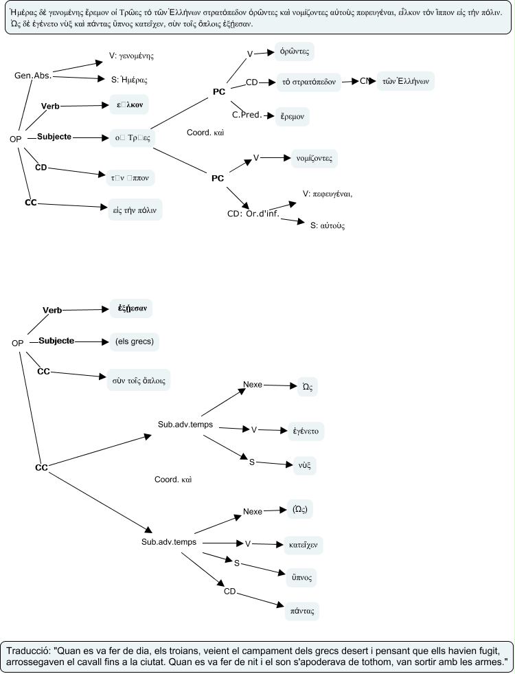Este Cmap, tiene información relacionada con: cavall de troia(II), Sub.adv.temps CD πάντας, OP CC εἰς τὴν πόλιν, οἱ Τρῶες PC, PC CD: Or.d'inf. V: πεφευγέναι,, OP CC Sub.adv.temps, PC V νομίζοντες, OP Subjecte οἱ Τρῶες, PC CD τὸ στρατόπεδον, OP Verb ἐξῄεσαν, PC V ὁρῶντες, PC CD: Or.d'inf. S: αὐτοὺς, OP Gen.Abs. V: γενομένης, Sub.adv.temps Nexe (Ὡς), Sub.adv.temps S νὺξ, Sub.adv.temps V ἐγένετο, οἱ Τρῶες PC, OP CC σὺν τοῖς ὅπλοις, OP Subjecte (els grecs), Sub.adv.temps V κατεῖχεν, PC C.Pred. ἔρεμον