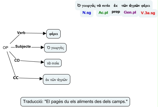 Aquest mapa conceptual conté informació relacionada amb: 2ndecl_11, OP Verb φέρει, OP CD τὰ σιτία, OP CC ἐκ τῶν ἀγρῶν, OP Subjecte Ὁ γεωργòς