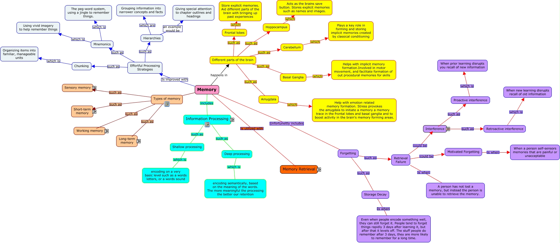 This Concept Map, created with IHMC CmapTools, has information related to: Chapter 8, Types of memory such as Sensory Memory, Sensory Memory would be Immediate and very brief, Types of memory such as Working memory, Memory Is improved with Effortful Processing Strategies, Retrieval Cues Aids in State-Dependent Memory, Memory happens in Different parts of the brain, State-Dependent Memory is when You remember things better when you are in the same state that your learned the information. For example if you learn something in a drunk state, you will have an easier time remembering it when you are drunk again., Forgetting such as Storage Decay, Right frontal lobe stores Things such as a visual scene, Context-Dependent Memory is when You remember things better in the context that you learned them, Left frontal lobe stores Things such as passwords, Long-term memory is a Permanent and limitless storehouse for memory, Hippocampus know as The brains save button, Mnemonics which is The peg-word system, using a jingle to remember things., Sensory input such as visual, Working memory includes Conscious processing of information retreived from long-term memory, Deep processing which is encoding semantically, based on the meaning of the words. The more meaningful the processing the better our retention, Short-term memory Includes Activated memory, Effortful processing includes Learing new skills, Interferance such as Retroactive interference