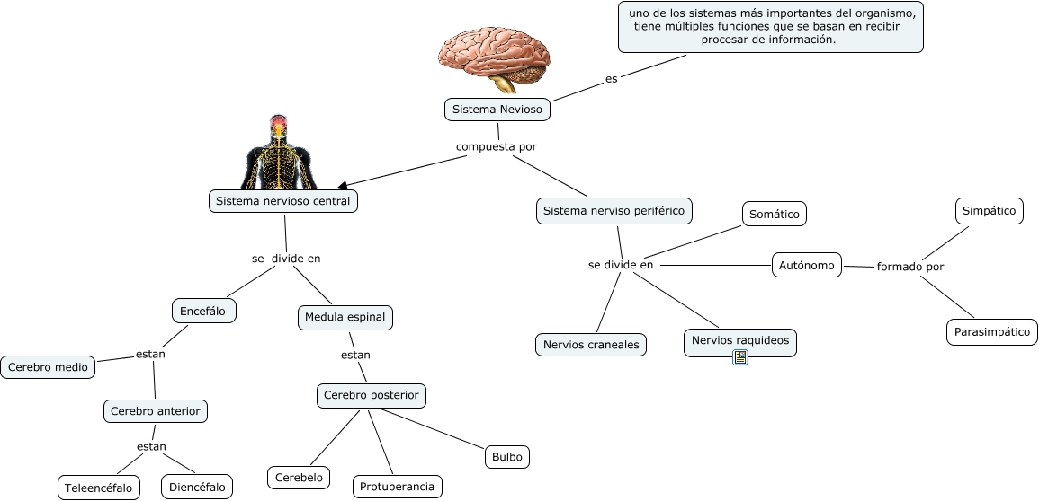 This Concept Map, created with IHMC CmapTools, has information related to: Mapa Ejemplo, Sistema Nevioso compuesta por Sistema nervioso central, Sistema nerviso periférico se divide en Autónomo, Encefálo estan Cerebro medio, Cerebro posterior ???? Protuberancia, Sistema nervioso central se divide en Medula espinal, Sistema Nevioso compuesta por Sistema nerviso periférico, Cerebro posterior ???? Bulbo, Teleencéfalo estan Diencéfalo, Sistema nervioso central se divide en Encefálo, Teleencéfalo estan Cerebro anterior, Medula espinal estan Cerebro posterior, Cerebro posterior ???? Cerebelo, Sistema nerviso periférico se divide en Nervios raquideos, uno de los sistemas más importantes del organismo, tiene múltiples funciones que se basan en recibir procesar de información. es Sistema Nevioso, Sistema nerviso periférico se divide en Nervios craneales, Autónomo formado por Parasimpático, Autónomo formado por Simpático, Sistema nerviso periférico se divide en Somático, Encefálo estan Cerebro anterior