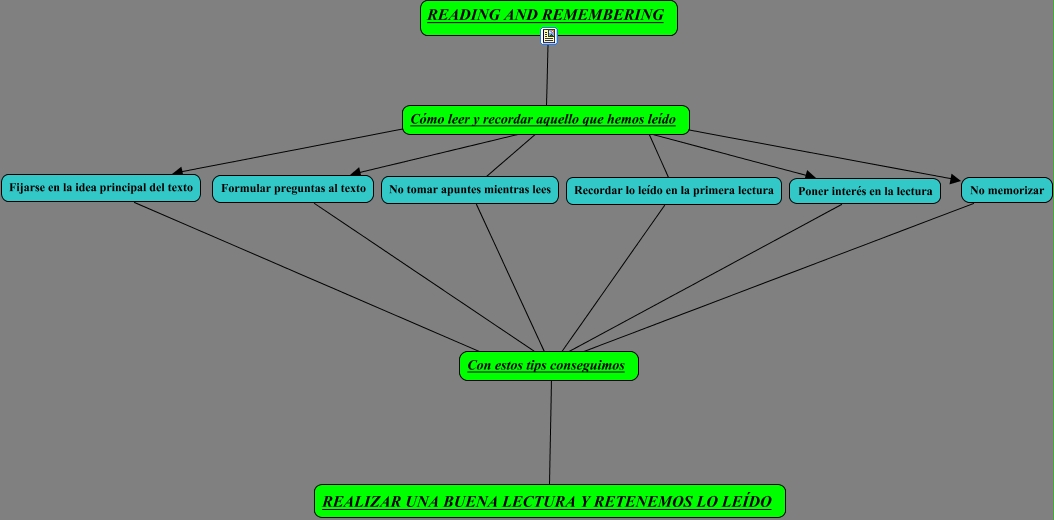 Este Cmap, tiene información relacionada con: Mapa conceptual, Recordar lo leído en la primera lectura ???? Con estos tips conseguimos, No memorizar ???? Con estos tips conseguimos, READING AND REMEMBERING ???? Cómo leer y recordar aquello que hemos leído, Cómo leer y recordar aquello que hemos leído ???? Recordar lo leído en la primera lectura, Con estos tips conseguimos ???? REALIZAR UNA BUENA LECTURA Y RETENEMOS LO LEÍDO, Cómo leer y recordar aquello que hemos leído ???? No memorizar, Cómo leer y recordar aquello que hemos leído ???? No tomar apuntes mientras lees, Cómo leer y recordar aquello que hemos leído ???? Fijarse en la idea principal del texto, Cómo leer y recordar aquello que hemos leído ???? Poner interés en la lectura, Formular preguntas al texto ???? Con estos tips conseguimos, Fijarse en la idea principal del texto ???? Con estos tips conseguimos, No tomar apuntes mientras lees ???? Con estos tips conseguimos, Poner interés en la lectura ???? Con estos tips conseguimos, Cómo leer y recordar aquello que hemos leído ???? Formular preguntas al texto