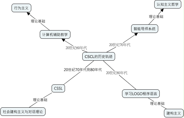 此概念图以 IHMC CmapTools 创建, 内含信息有关于: L1-1, CSSL 理论基础 社会建构主义与对话理论, CSCL的历史轨迹 20世纪80年代 学习LOGO程序语言, CSCL的历史轨迹 20世纪60年代 计算机辅助教学, CSCL的历史轨迹 20世纪70年代 智能导师系统, 学习LOGO程序语言 理论基础 建构主义, 智能导师系统 理论基础 认知主义哲学, 计算机辅助教学 理论基础 行为主义, CSCL的历史轨迹 20世纪70年代到80年代 CSSL
