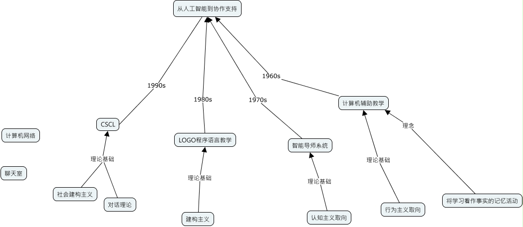 此概念图以 IHMC CmapTools 创建, 内含信息有关于: 未命名 3, 行为主义取向 理论基础 计算机辅助教学, 智能导师系统 1970s 从人工智能到协作支持, 社会建构主义 理论基础 CSCL, 将学习看作事实的记忆活动 理念 计算机辅助教学, 从人工智能到协作支持 1990s CSCL, 对话理论 理论基础 CSCL, LOGO程序语言教学 1980s 从人工智能到协作支持, 建构主义 理论基础 LOGO程序语言教学, 认知主义取向 理论基础 智能导师系统