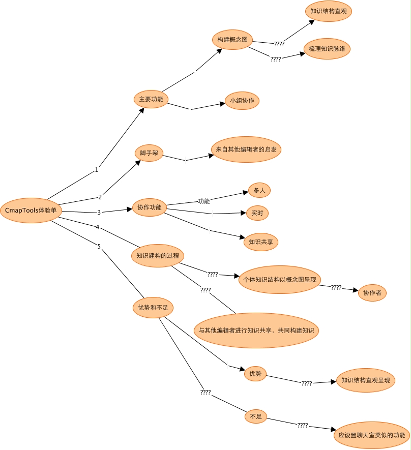 此概念图以 IHMC CmapTools 创建, 内含信息有关于: 未命名, 个体知识结构以概念图呈现 ???? 协作者, CmapTools体验单 1 主要功能, 协作功能 功能 多人, 知识建构的过程 ???? 个体知识结构以概念图呈现, 主要功能 小组协作, 知识建构的过程 ???? 与其他编辑者进行知识共享,共同构建知识, 主要功能 构建概念图, 构建概念图 ???? 梳理知识脉络, CmapTools体验单 4 知识建构的过程, CmapTools体验单 3 协作功能, 构建概念图 ???? 知识结构直观, 优势 ???? 知识结构直观呈现, 协作功能 实时, 优势和不足 优势, CmapTools体验单 5 优势和不足, CmapTools体验单 2 脚手架, 脚手架 来自其他编辑者的启发, 优势和不足 ???? 不足, 不足 ???? 应设置聊天室类似的功能, 协作功能 知识共享