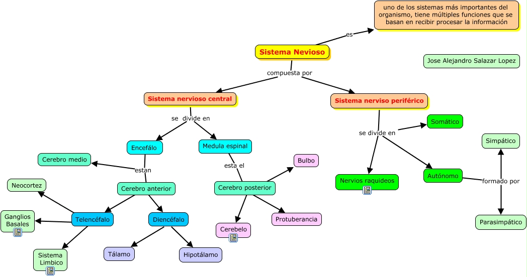 Este Cmap, tiene información relacionada con: Sistema Nervioso, Cerebro anterior ???? Telencéfalo, Medula espinal esta el Cerebro posterior, Diencéfalo ???? Tálamo, Sistema Nevioso compuesta por Sistema nervioso central, Sistema nervioso central se divide en Medula espinal, Sistema Nevioso compuesta por Sistema nerviso periférico, Telencéfalo ???? Sistema Limbico, Autónomo formado por Parasimpático, Sistema Nevioso es uno de los sistemas más importantes del organismo, tiene múltiples funciones que se basan en recibir procesar la información, Cerebro posterior ???? Cerebelo, Encefálo estan Cerebro medio, Autónomo formado por Simpático, Cerebro anterior ???? Diencéfalo, Telencéfalo ???? Ganglios Basales, Cerebro posterior ???? Bulbo, Sistema nerviso periférico se divide en Autónomo, Sistema nerviso periférico se divide en Somático, Telencéfalo ???? Neocortez, Sistema nervioso central se divide en Encefálo, Sistema nerviso periférico se divide en Nervios raquideos