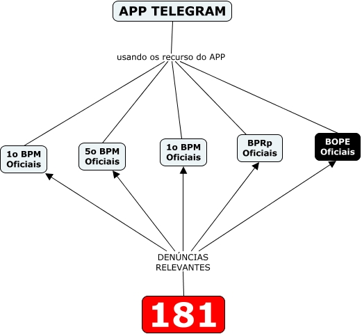Esse mapa conceitual, produzido no IHMC CmapTools, tem a informação relacionada a: 181, 181 DENÚNCIAS RELEVANTES 1o BPM Oficiais, APP TELEGRAM usando os recurso do APP 1o BPM Oficiais, APP TELEGRAM usando os recurso do APP BPRp Oficiais, APP TELEGRAM usando os recurso do APP 5o BPM Oficiais, 181 DENÚNCIAS RELEVANTES 1o BPM Oficiais, APP TELEGRAM usando os recurso do APP 1o BPM Oficiais, 181 DENÚNCIAS RELEVANTES 5o BPM Oficiais, 181 DENÚNCIAS RELEVANTES BOPE Oficiais, 181 DENÚNCIAS RELEVANTES BPRp Oficiais, APP TELEGRAM usando os recurso do APP BOPE Oficiais