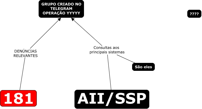 Esse mapa conceitual, produzido no IHMC CmapTools, tem a informação relacionada a: 00. esquema de uma operacao - sedres, AII/SSP Consultas aos principais sistemas São eles, 181 DENÚNCIAS RELEVANTES GRUPO CRIADO NO TELEGRAM OPERAÇÃO YYYYY, AII/SSP Consultas aos principais sistemas GRUPO CRIADO NO TELEGRAM OPERAÇÃO YYYYY