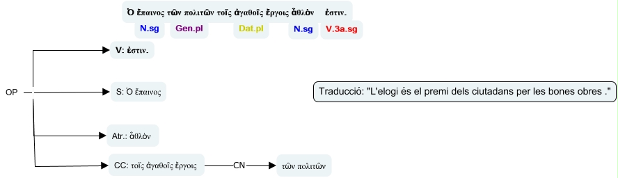 Aquest mapa conceptual conté informació relacionada amb: 2ndecl_30, OP Atr.: ἆθλόν, OP S: Ὁ ἔπαινος, OP CC: τοϊς ἀγαθοῖς ἔργοις, CC: τοϊς ἀγαθοῖς ἔργοις CN τῶν πολιτῶν, OP V: ἐστιν.