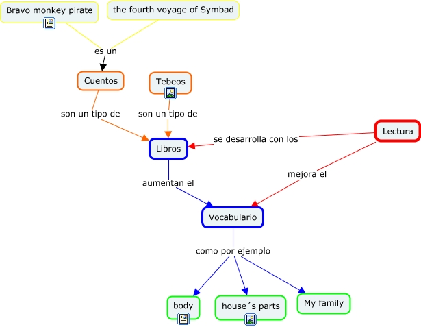 Este Cmap, tiene información relacionada con: lectura, Cuentos son un tipo de Libros, the fourth voyage of Symbad es un Cuentos, Lectura se desarrolla con los Libros, Vocabulario como por ejemplo My family, Bravo monkey pirate es un Cuentos, Vocabulario como por ejemplo house´s parts, Vocabulario como por ejemplo body, Tebeos son un tipo de Libros, Lectura mejora el Vocabulario, Libros aumentan el Vocabulario