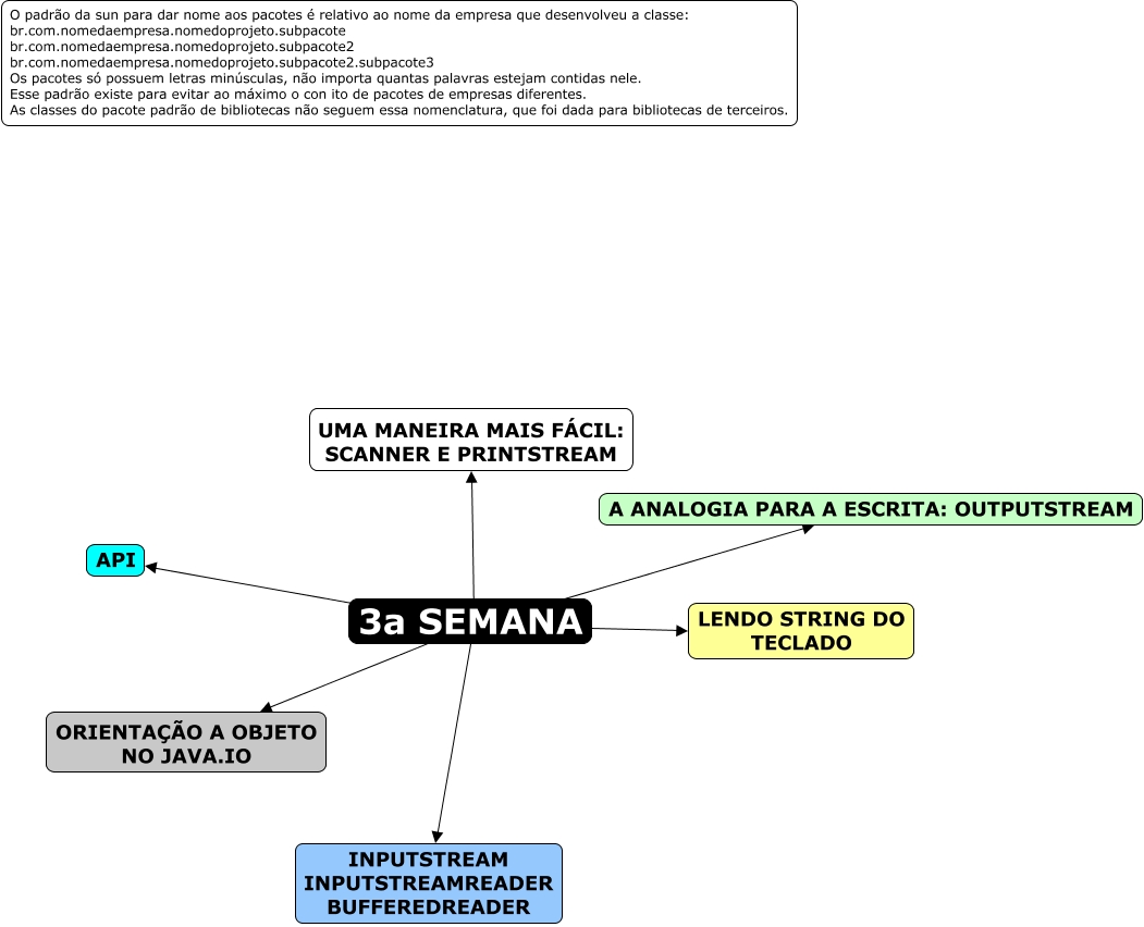 Esse mapa conceitual, produzido no IHMC CmapTools, tem a informação relacionada a: 04. 4a semana, 3a SEMANA temas ORIENTAÇÃO A OBJETO NO JAVA.IO, 3a SEMANA temas A ANALOGIA PARA A ESCRITA: OUTPUTSTREAM, 3a SEMANA temas INPUTSTREAM INPUTSTREAMREADER BUFFEREDREADER, 3a SEMANA temas UMA MANEIRA MAIS FÁCIL: SCANNER E PRINTSTREAM, 3a SEMANA temas LENDO STRING DO TECLADO, 3a SEMANA temas API