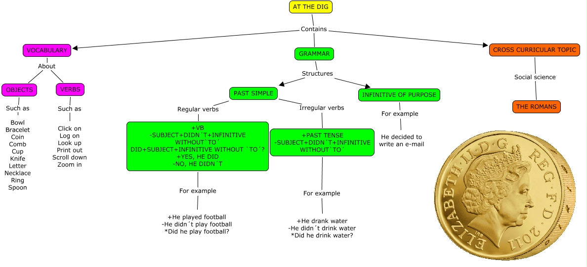Este Cmap, tiene información relacionada con: AT THE DIG-Miguel Jaureguízar del moral, VERBS Such as Click on Log on Look up Print out Scroll down Zoom in, INFINITIVE OF PURPOSE For example He decided to write an e-mail, AT THE DIG Contains GRAMMAR, GRAMMAR Structures PAST SIMPLE, VOCABULARY About OBJECTS, PAST SIMPLE Regular verbs +VB -SUBJECT+DIDN´T+INFINITIVE WITHOUT`TO´ DID+SUBJECT+INFINITIVE WITHOUT `TO´? +YES, HE DID -NO, HE DIDN´T, AT THE DIG Contains CROSS CURRICULAR TOPIC, VOCABULARY About VERBS, GRAMMAR Structures INFINITIVE OF PURPOSE, PAST SIMPLE Irregular verbs +PAST TENSE -SUBJECT+DIDN´T+INFINITIVE WITHOUT`TO´, OBJECTS Such as Bowl Bracelet Coin Comb Cup Knife Letter Necklace Ring Spoon, +VB -SUBJECT+DIDN´T+INFINITIVE WITHOUT`TO´ DID+SUBJECT+INFINITIVE WITHOUT `TO´? +YES, HE DID -NO, HE DIDN´T For example +He played football -He didn´t play football *Did he play football?, CROSS CURRICULAR TOPIC Social science THE ROMANS, AT THE DIG Contains VOCABULARY, +PAST TENSE -SUBJECT+DIDN´T+INFINITIVE WITHOUT`TO´ For example +He drank water -He didn´t drink water *Did he drink water?