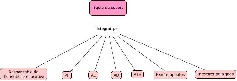 Este Cmap, tiene información relacionada con: suport, Equip de suport integrat per PT, Equip de suport integrat per Responsable de l'orientació educativa, Equip de suport integrat per AD, Equip de suport integrat per Fisioterapeutes, Equip de suport integrat per ATE, Equip de suport integrat per Interpret de signes, Equip de suport integrat per AL