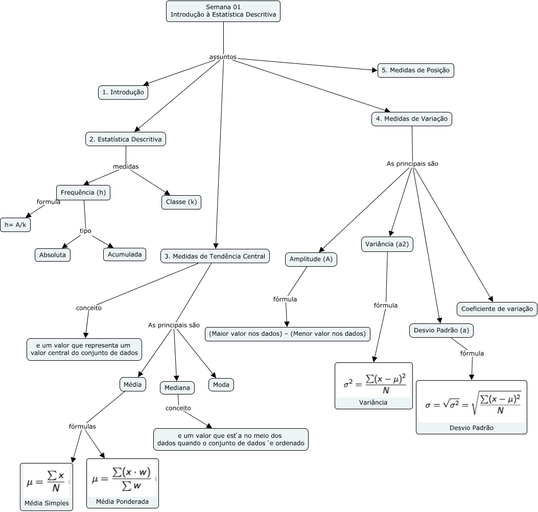 Esse mapa conceitual, produzido no IHMC CmapTools, tem a informação relacionada a: 1a semana, 4. Medidas de Variação As principais são Variância (a2), Semana 01 Introdução à Estatística Descritiva assuntos 1. Introdução, 4. Medidas de Variação As principais são Desvio Padrão (a), 3. Medidas de Tendência Central As principais são Média, Desvio Padrão (a) fórmula Desvio Padrão, 3. Medidas de Tendência Central conceito e um valor que representa um valor central do conjunto de dados, Frequência (h) tipo Acumulada, Média fórmulas Média Simples, Semana 01 Introdução à Estatística Descritiva assuntos 4. Medidas de Variação, Semana 01 Introdução à Estatística Descritiva assuntos 5. Medidas de Posição, Frequência (h) tipo Absoluta, 4. Medidas de Variação As principais são Amplitude (A), 2. Estatística Descritiva medidas Classe (k), Mediana conceito e um valor que est ́a no meio dos dados quando o conjunto de dados ́e ordenado, Semana 01 Introdução à Estatística Descritiva assuntos 2. Estatística Descritiva, Frequência (h) formula h= A/k, Semana 01 Introdução à Estatística Descritiva assuntos 3. Medidas de Tendência Central, Variância (a2) fórmula Variância, 2. Estatística Descritiva medidas Frequência (h), 3. Medidas de Tendência Central As principais são Moda