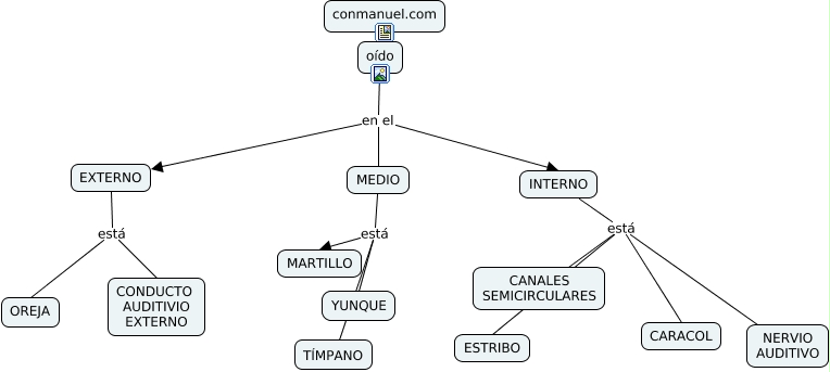 This Concept Map, created with IHMC CmapTools, has information related to: 2-sentido-oido, MEDIO está TÍMPANO, INTERNO está ESTRIBO, oído en el EXTERNO, oído en el MEDIO, MEDIO está YUNQUE, INTERNO está NERVIO AUDITIVO, EXTERNO está OREJA, EXTERNO está CONDUCTO AUDITIVIO EXTERNO, MEDIO está MARTILLO, INTERNO está CARACOL, oído en el INTERNO, INTERNO está CANALES SEMICIRCULARES