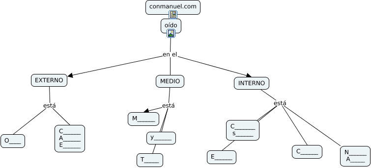 This Concept Map, created with IHMC CmapTools, has information related to: Copy of 2-sentido-oido, MEDIO está T_____, INTERNO está E______, oído en el EXTERNO, oído en el MEDIO, MEDIO está y______, INTERNO está N______ A_____, EXTERNO está O____, EXTERNO está C______ A______ E______, MEDIO está M______, INTERNO está C______, oído en el INTERNO, INTERNO está C_______ s______