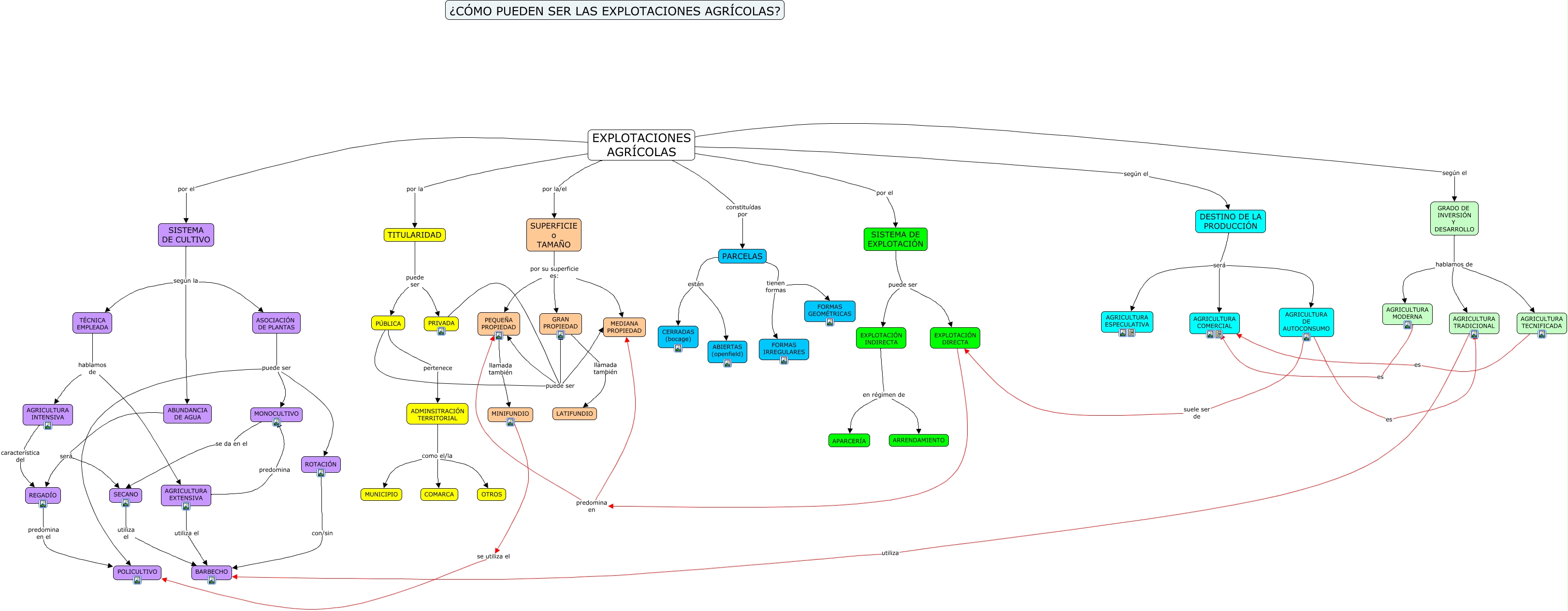 Este Cmap, tiene información relacionada con: Los espacios agrarios, SISTEMA DE CULTIVO según la TÉCNICA EMPLEADA, PÚBLICA puede ser MEDIANA PROPIEDAD, AGRICULTURA EXTENSIVA utiliza el BARBECHO, PRIVADA puede ser PEQUEÑA PROPIEDAD, MONOCULTIVO se da en el SECANO, EXPLOTACIÓN DIRECTA predomina en MEDIANA PROPIEDAD, PÚBLICA puede ser PEQUEÑA PROPIEDAD, SISTEMA DE CULTIVO según la ASOCIACIÓN DE PLANTAS, PEQUEÑA PROPIEDAD llamada también MINIFUNDIO, ABUNDANCIA DE AGUA será SECANO, AGRICULTURA INTENSIVA característica del REGADÍO, SISTEMA DE EXPLOTACIÓN puede ser EXPLOTACIÓN INDIRECTA, PARCELAS están ABIERTAS (openfield), EXPLOTACIONES AGRÍCOLAS por la TITULARIDAD, EXPLOTACIÓN INDIRECTA en régimen de ARRENDAMIENTO, ASOCIACIÓN DE PLANTAS puede ser MONOCULTIVO, ASOCIACIÓN DE PLANTAS puede ser ROTACIÓN, ADMINSITRACIÓN TERRITORIAL como el/la MUNICIPIO, DESTINO DE LA PRODUCCIÓN será AGRICULTURA DE AUTOCONSUMO, EXPLOTACIÓN INDIRECTA en régimen de APARCERÍA
