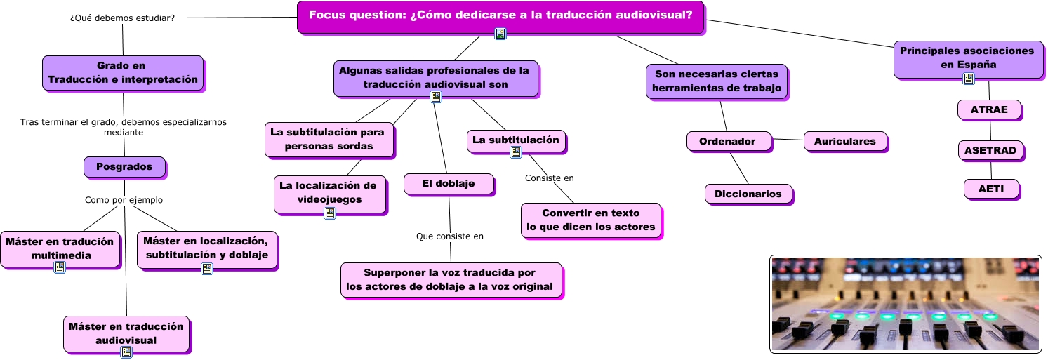 Este Cmap, tiene información relacionada con: Cmap Focus question, Focus question: ¿Cómo dedicarse a la traducción audiovisual? ¿Qué debemos estudiar? Grado en Traducción e interpretación, Ordenador ???? Diccionarios, Posgrados Como por ejemplo Máster en localización, subtitulación y doblaje, La subtitulación Consiste en Convertir en texto lo que dicen los actores, ASETRAD ???? AETI, Ordenador ???? Auriculares, Focus question: ¿Cómo dedicarse a la traducción audiovisual? ???? Algunas salidas profesionales de la traducción audiovisual son, Principales asociaciones en España ???? ATRAE, Posgrados Como por ejemplo Máster en traducción audiovisual, ATRAE ???? ASETRAD, Algunas salidas profesionales de la traducción audiovisual son ???? El doblaje, Posgrados Como por ejemplo Máster en tradución multimedia, Algunas salidas profesionales de la traducción audiovisual son La subtitulación para personas sordas, Algunas salidas profesionales de la traducción audiovisual son ???? La subtitulación, Focus question: ¿Cómo dedicarse a la traducción audiovisual? ???? Principales asociaciones en España, Focus question: ¿Cómo dedicarse a la traducción audiovisual? ???? Son necesarias ciertas herramientas de trabajo, El doblaje Que consiste en Superponer la voz traducida por los actores de doblaje a la voz original, Grado en Traducción e interpretación Tras terminar el grado, debemos especializarnos mediante Posgrados, Son necesarias ciertas herramientas de trabajo ???? Ordenador, Algunas salidas profesionales de la traducción audiovisual son ???? La localización de videojuegos