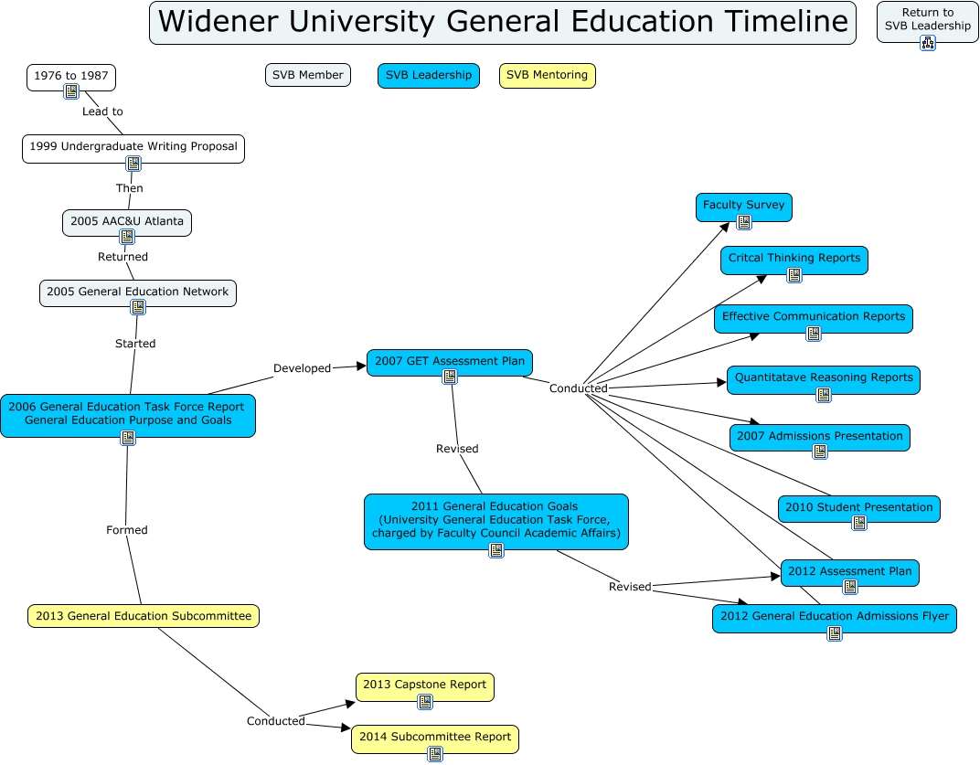 This Concept Map, created with IHMC CmapTools, has information related to: Widener General Education Timeline, 2007 GET Assessment Plan Conducted Faculty Survey, 1976 to 1987 Lead to 1999 Undergraduate Writing Proposal, 2007 GET Assessment Plan Conducted Effective Communication Reports, 2005 General Education Network Started 2006 General Education Task Force Report General Education Purpose and Goals, 2007 GET Assessment Plan Conducted Quantitatave Reasoning Reports, 2011 General Education Goals (University General Education Task Force, charged by Faculty Council Academic Affairs) Revised 2012 Assessment Plan, 2006 General Education Task Force Report General Education Purpose and Goals Formed 2013 General Education Subcommittee, 2013 General Education Subcommittee Conducted 2014 Subcommittee Report, 2007 GET Assessment Plan Conducted 2012 Assessment Plan, 2006 General Education Task Force Report General Education Purpose and Goals Developed 2007 GET Assessment Plan, 2007 GET Assessment Plan Conducted 2010 Student Presentation, 2007 GET Assessment Plan Conducted 2007 Admissions Presentation, 2007 GET Assessment Plan Conducted 2012 General Education Admissions Flyer, 2005 AAC&U Atlanta Returned 2005 General Education Network, 2013 General Education Subcommittee Conducted 2013 Capstone Report, 2011 General Education Goals (University General Education Task Force, charged by Faculty Council Academic Affairs) Revised 2012 General Education Admissions Flyer, 2007 GET Assessment Plan Revised 2011 General Education Goals (University General Education Task Force, charged by Faculty Council Academic Affairs), 2007 GET Assessment Plan Conducted Critcal Thinking Reports, 1999 Undergraduate Writing Proposal Then 2005 AAC&U Atlanta