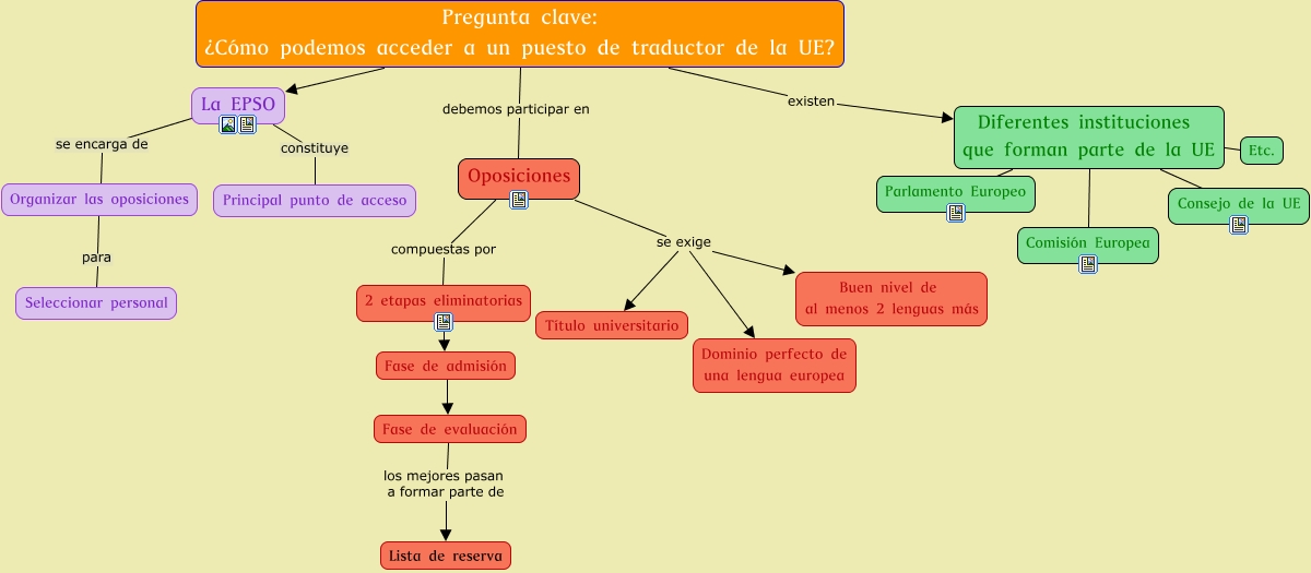 Este Cmap, tiene información relacionada con: Pregunta clave, Pregunta clave: ¿Cómo podemos acceder a un puesto de traductor de la UE? La EPSO, Pregunta clave: ¿Cómo podemos acceder a un puesto de traductor de la UE? debemos participar en Oposiciones, Diferentes instituciones que forman parte de la UE Parlamento Europeo, La EPSO constituye Principal punto de acceso, Diferentes instituciones que forman parte de la UE Etc., Oposiciones compuestas por 2 etapas eliminatorias, Fase de admisión Fase de evaluación, Fase de evaluación los mejores pasan a formar parte de Lista de reserva, Diferentes instituciones que forman parte de la UE Consejo de la UE, Diferentes instituciones que forman parte de la UE Comisión Europea, Oposiciones se exige Buen nivel de al menos 2 lenguas más, Pregunta clave: ¿Cómo podemos acceder a un puesto de traductor de la UE? existen Diferentes instituciones que forman parte de la UE, Organizar las oposiciones para Seleccionar personal, 2 etapas eliminatorias Fase de admisión, La EPSO se encarga de Organizar las oposiciones, Oposiciones se exige Dominio perfecto de una lengua europea, Oposiciones se exige Título universitario