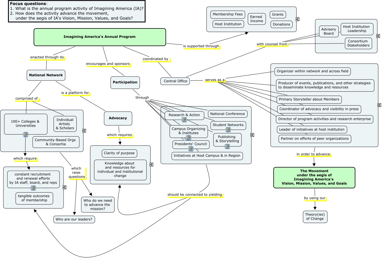 This Concept Map, created with IHMC CmapTools, has information related to: IA Program RVSD Jan 2016, Activities should be connected to yielding ????, Central Office serves as a Director of program activities and research enterprise, Imagining America's Annual Program coordinated by Central Office, Consortium which raise questions Who do we need to advance the mission?, Participation through Research & Action, Participation through National Conference, National Network comprised of 100+ Colleges & Universities, Participation through Publishing & Storytelling, National Network comprised of Individual Artists & Scholars, 100+ Colleges & Universities which require constant recruitment and renewal efforts by IA staff, board, and reps, Participation through Initiatives at Host Campus & in Region, Central Office serves as a Leader of initiatives at host institution, Central Office serves as a Partner on efforts of peer organizations, Central Office with counsel from Advisory Board, Imagining America's Annual Program encourages and sponsors Participation, Consortium which raise questions Who are our leaders?, Central Office serves as a Primary Storyteller about Members, Activities should be connected to yielding ????, National Network is a platform for Advocacy, Central Office with counsel from Consortium Stakeholders