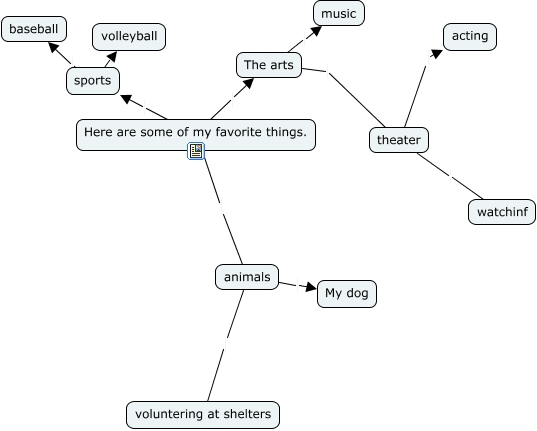 This Concept Map, created with IHMC CmapTools, has information related to: here are some of my favorite things, animals My dog, Here are some of my favorite things. animals, The arts theater, animals voluntering at shelters, theater watchinf, theater acting, Here are some of my favorite things. The arts, Here are some of my favorite things. sports, The arts music, sports baseball, sports volleyball