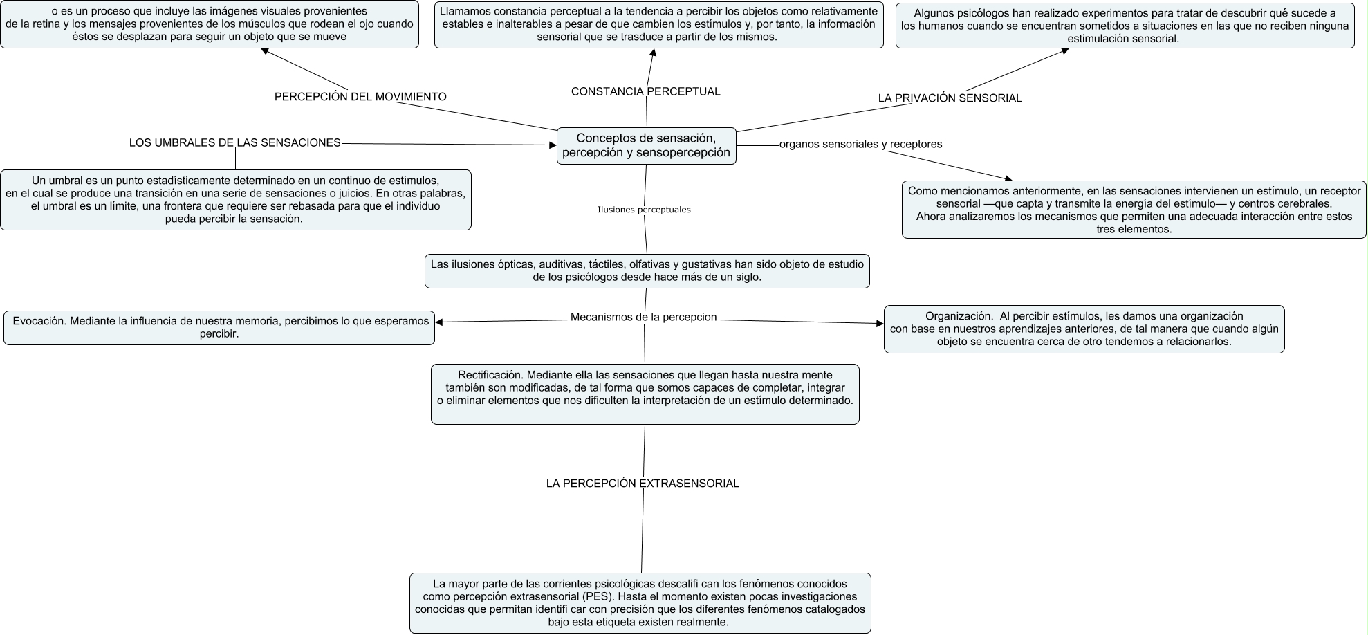 Este Cmap, tiene información relacionada con: BettyFG, Las ilusiones ópticas, auditivas, táctiles, olfativas y gustativas han sido objeto de estudio de los psicólogos desde hace más de un siglo. Mecanismos de la percepcion Organización. Al percibir estímulos, les damos una organización con base en nuestros aprendizajes anteriores, de tal manera que cuando algún objeto se encuentra cerca de otro tendemos a relacionarlos., Un umbral es un punto estadísticamente determinado en un continuo de estímulos, en el cual se produce una transición en una serie de sensaciones o juicios. En otras palabras, el umbral es un límite, una frontera que requiere ser rebasada para que el individuo pueda percibir la sensación. LOS UMBRALES DE LAS SENSACIONES Conceptos de sensación, percepción y sensopercepción, Conceptos de sensación, percepción y sensopercepción LA PRIVACIÓN SENSORIAL Algunos psicólogos han realizado experimentos para tratar de descubrir qué sucede a los humanos cuando se encuentran sometidos a situaciones en las que no reciben ninguna estimulación sensorial., Las ilusiones ópticas, auditivas, táctiles, olfativas y gustativas han sido objeto de estudio de los psicólogos desde hace más de un siglo. Mecanismos de la percepcion Evocación. Mediante la influencia de nuestra memoria, percibimos lo que esperamos percibir., Conceptos de sensación, percepción y sensopercepción PERCEPCIÓN DEL MOVIMIENTO o es un proceso que incluye las imágenes visuales provenientes de la retina y los mensajes provenientes de los músculos que rodean el ojo cuando éstos se desplazan para seguir un objeto que se mueve, Conceptos de sensación, percepción y sensopercepción Ilusiones perceptuales Las ilusiones ópticas, auditivas, táctiles, olfativas y gustativas han sido objeto de estudio de los psicólogos desde hace más de un siglo., Las ilusiones ópticas, auditivas, táctiles, olfativas y gustativas han sido objeto de estudio de los psicólogos desde hace más de un siglo. Mecanismos de la percepcion Rectificación. Mediante ella las sensaciones que llegan hasta nuestra mente también son modificadas, de tal forma que somos capaces de completar, integrar o eliminar elementos que nos dificulten la interpretación de un estímulo determinado., Conceptos de sensación, percepción y sensopercepción CONSTANCIA PERCEPTUAL Llamamos constancia perceptual a la tendencia a percibir los objetos como relativamente estables e inalterables a pesar de que cambien los estímulos y, por tanto, la información sensorial que se trasduce a partir de los mismos., Conceptos de sensación, percepción y sensopercepción organos sensoriales y receptores Como mencionamos anteriormente, en las sensaciones intervienen un estímulo, un receptor sensorial —que capta y transmite la energía del estímulo— y centros cerebrales. Ahora analizaremos los mecanismos que permiten una adecuada interacción entre estos tres elementos., Rectificación. Mediante ella las sensaciones que llegan hasta nuestra mente también son modificadas, de tal forma que somos capaces de completar, integrar o eliminar elementos que nos dificulten la interpretación de un estímulo determinado. LA PERCEPCIÓN EXTRASENSORIAL La mayor parte de las corrientes psicológicas descalifi can los fenómenos conocidos como percepción extrasensorial (PES). Hasta el momento existen pocas investigaciones conocidas que permitan identifi car con precisión que los diferentes fenómenos catalogados bajo esta etiqueta existen realmente.