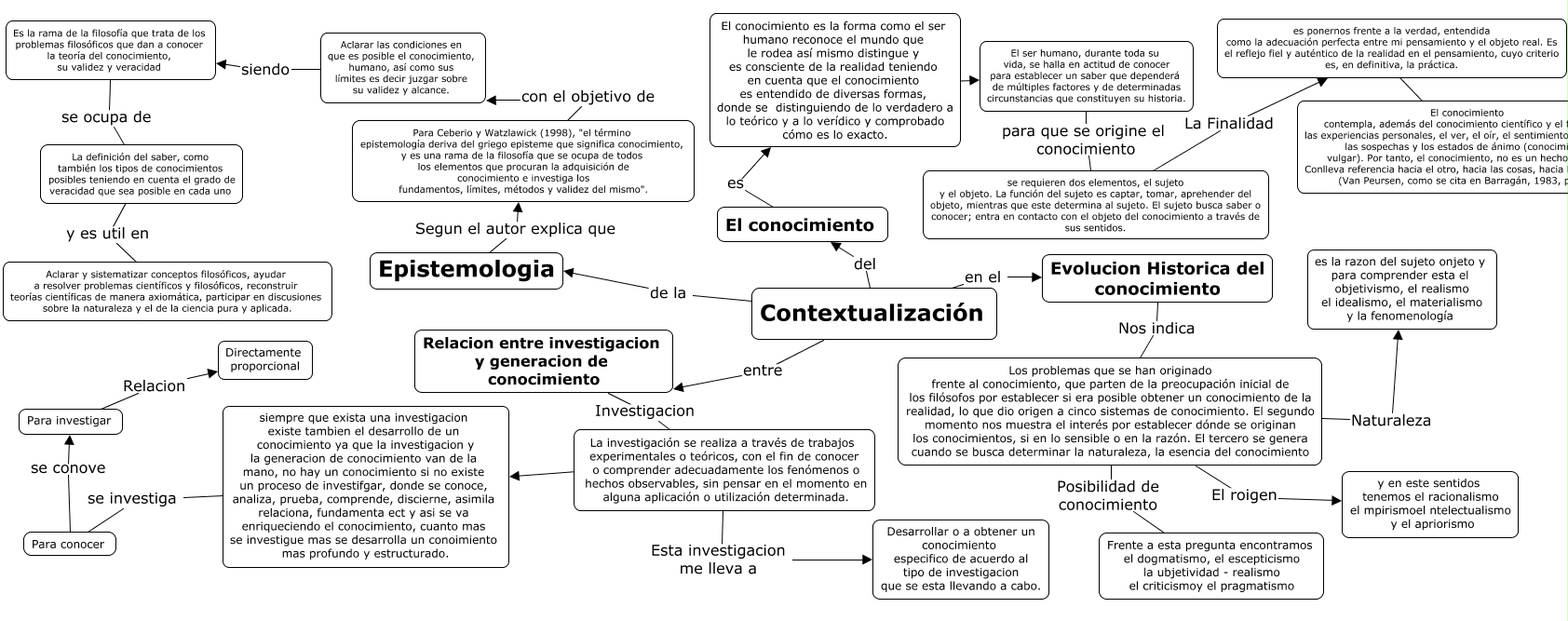 Este Cmap, tiene información relacionada con: armandfg, Evolucion Historica del conocimiento Nos indica Los problemas que se han originado frente al conocimiento, que parten de la preocupación inicial de los filósofos por establecer si era posible obtener un conocimiento de la realidad, lo que dio origen a cinco sistemas de conocimiento. El segundo momento nos muestra el interés por establecer dónde se originan los conocimientos, si en lo sensible o en la razón. El tercero se genera cuando se busca determinar la naturaleza, la esencia del conocimiento, siempre que exista una investigacion existe tambien el desarrollo de un conocimiento ya que la investigacion y la generacion de conocimiento van de la mano, no hay un conocimiento si no existe un proceso de investifgar, donde se conoce, analiza, prueba, comprende, discierne, asimila relaciona, fundamenta ect y asi se va enriqueciendo el conocimiento, cuanto mas se investigue mas se desarrolla un conoimiento mas profundo y estructurado. se investiga Para conocer, La definición del saber, como también los tipos de conocimientos posibles teniendo en cuenta el grado de veracidad que sea posible en cada uno y es util en Aclarar y sistematizar conceptos filosóficos, ayudar a resolver problemas científicos y filosóficos, reconstruir teorías científicas de manera axiomática, participar en discusiones sobre la naturaleza y el de la ciencia pura y aplicada., Para investigar Relacion Directamente proporcional, Los problemas que se han originado frente al conocimiento, que parten de la preocupación inicial de los filósofos por establecer si era posible obtener un conocimiento de la realidad, lo que dio origen a cinco sistemas de conocimiento. El segundo momento nos muestra el interés por establecer dónde se originan los conocimientos, si en lo sensible o en la razón. El tercero se genera cuando se busca determinar la naturaleza, la esencia del conocimiento El roigen y en este sentidos tenemos el racionalismo el mpirismoel ntelectualismo y el apriorismo, se requieren dos elementos, el sujeto y el objeto. La función del sujeto es captar, tomar, aprehender del objeto, mientras que este determina al sujeto. El sujeto busca saber o conocer; entra en contacto con el objeto del conocimiento a través de sus sentidos. La Finalidad es ponernos frente a la verdad, entendida como la adecuación perfecta entre mi pensamiento y el objeto real. Es el reflejo fiel y auténtico de la realidad en el pensamiento, cuyo criterio es, en definitiva, la práctica., Contextualización del El conocimiento, Contextualización en el Evolucion Historica del conocimiento, Es la rama de la filosofía que trata de los problemas filosóficos que dan a conocer la teoría del conocimiento, su validez y veracidad se ocupa de La definición del saber, como también los tipos de conocimientos posibles teniendo en cuenta el grado de veracidad que sea posible en cada uno, Epistemologia Segun el autor explica que Para Ceberio y Watzlawick (1998), "el término epistemología deriva del griego episteme que significa conocimiento, y es una rama de la filosofía que se ocupa de todos los elementos que procuran la adquisición de conocimiento e investiga los fundamentos, límites, métodos y validez del mismo"., Aclarar las condiciones en que es posible el conocimiento, humano, así como sus límites es decir juzgar sobre su validez y alcance. siendo Es la rama de la filosofía que trata de los problemas filosóficos que dan a conocer la teoría del conocimiento, su validez y veracidad, Para Ceberio y Watzlawick (1998), "el término epistemología deriva del griego episteme que significa conocimiento, y es una rama de la filosofía que se ocupa de todos los elementos que procuran la adquisición de conocimiento e investiga los fundamentos, límites, métodos y validez del mismo". con el objetivo de Aclarar las condiciones en que es posible el conocimiento, humano, así como sus límites es decir juzgar sobre su validez y alcance., Los problemas que se han originado frente al conocimiento, que parten de la preocupación inicial de los filósofos por establecer si era posible obtener un conocimiento de la realidad, lo que dio origen a cinco sistemas de conocimiento. El segundo momento nos muestra el interés por establecer dónde se originan los conocimientos, si en lo sensible o en la razón. El tercero se genera cuando se busca determinar la naturaleza, la esencia del conocimiento Naturaleza es la razon del sujeto onjeto y para comprender esta el objetivismo, el realismo el idealismo, el materialismo y la fenomenología, Relacion entre investigacion y generacion de conocimiento Investigacion La investigación se realiza a través de trabajos experimentales o teóricos, con el fin de conocer o comprender adecuadamente los fenómenos o hechos observables, sin pensar en el momento en alguna aplicación o utilización determinada., El conocimiento es El conocimiento es la forma como el ser humano reconoce el mundo que le rodea así mismo distingue y es consciente de la realidad teniendo en cuenta que el conocimiento es entendido de diversas formas, donde se distinguiendo de lo verdadero a lo teórico y a lo verídico y comprobado cómo es lo exacto., La investigación se realiza a través de trabajos experimentales o teóricos, con el fin de conocer o comprender adecuadamente los fenómenos o hechos observables, sin pensar en el momento en alguna aplicación o utilización determinada. Esta investigacion me lleva a Desarrollar o a obtener un conocimiento especifico de acuerdo al tipo de investigacion que se esta llevando a cabo., El ser humano, durante toda su vida, se halla en actitud de conocer para establecer un saber que dependerá de múltiples factores y de determinadas circunstancias que constituyen su historia. para que se origine el conocimiento se requieren dos elementos, el sujeto y el objeto. La función del sujeto es captar, tomar, aprehender del objeto, mientras que